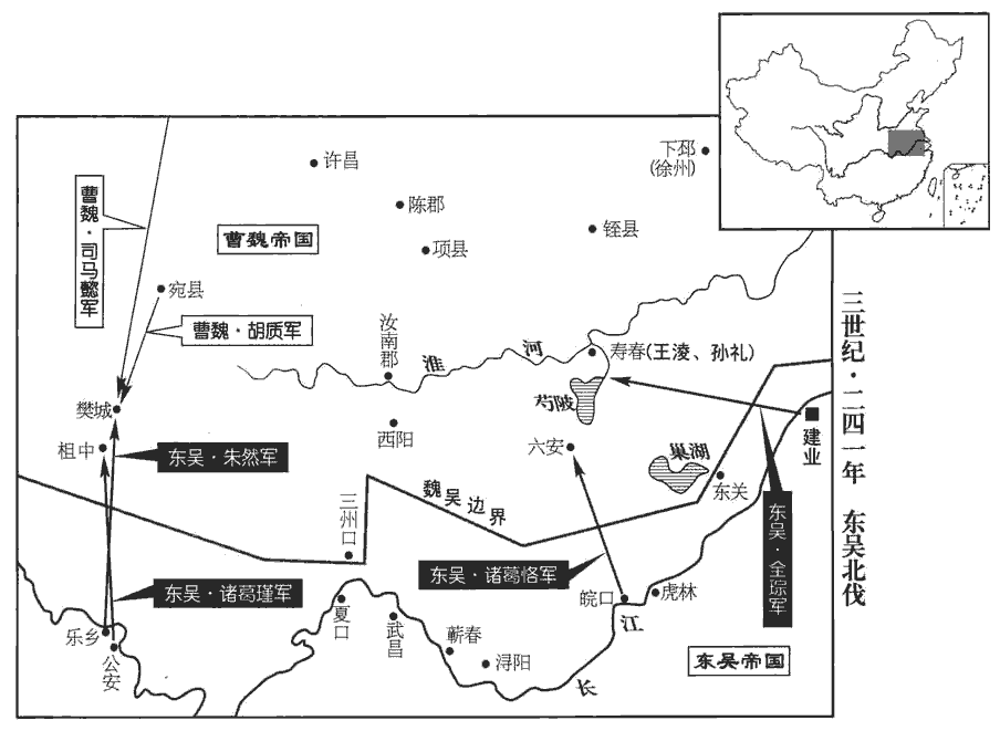 2吳諸葛恪‹时驻皖口,安徽安庆›襲六安‹安徽六安›,漢六安國都六縣;後漢為六安侯國,屬廬江郡;晉為六縣,屬廬江郡。掩其人民而去。