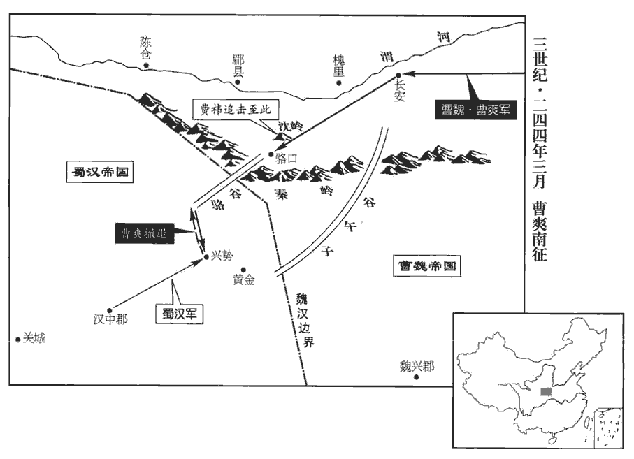2征西將軍、都督雍、涼諸軍事夏侯玄,雍,於用翻。大將軍爽之姑子也。玄辟李勝為長史,勝及尚書鄧颺欲令爽立威名於天下,勸使伐蜀;太傅懿止之,不能得。三月,爽西至長安,發卒十餘萬人,與玄自駱口‹陕西周至西南›入漢中‹陕西汉中›。駱口,駱谷口也。駱谷在漢中成固縣東北,北達扶風郿縣。