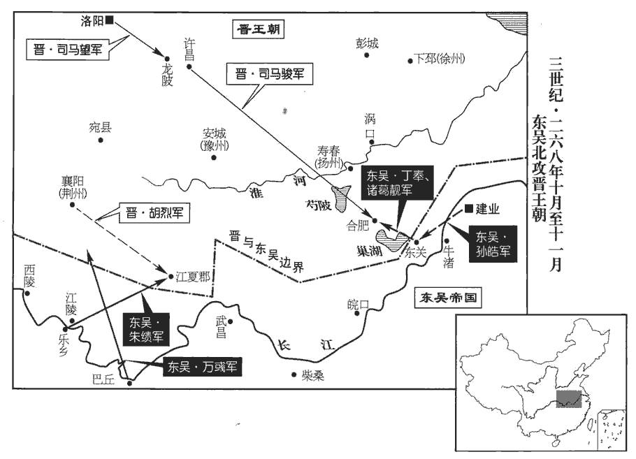 3吳人刁玄詐增讖文曰:「黃旗紫蓋,見於東南,終有天下者,荊、揚之君。」姓譜:刁姓,齊大夫豎刁之後。余按:豎刁安得有後!漢書貨殖傳有刁間。江表傳曰:玄使蜀,得司馬徽論運命曆數事,因詐增其文以誑吳人。見,賢遍翻。吳主‹孙皓,时年三十›信之。是月晦‹三十›,大舉兵出華里,華里在建業西。載太后、皇后及後宮數千人,從牛渚‹安徽马鞍山西南采石矶›西上。水經註:牛渚在姑孰、烏江兩縣界中,今太平州當塗縣北三十里有牛渚山,山下有牛渚磯,與和州橫江渡相對。杜佑曰:牛渚圻qí即今當塗縣采石。東觀令華覈等固諫,不聽。東觀令,典校圖書及記述。觀,古玩翻。華,戶化翻。覈,戶革翻。行遇大雪,道塗陷壞,兵士被甲持仗,被,皮義翻。百人共引一車,寒凍殆死,皆曰:「若遇敌,便當倒戈。」紂發兵與周武王會戰于牧野,前徒倒戈攻其後,以北。吳主聞之,乃還。還,從宣翻,又如字。帝遣義陽王望統中軍二萬、騎三千屯壽春‹安徽寿县›以備之。聞吳師退,乃罷。