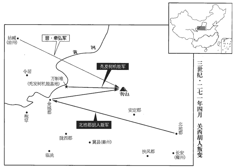 6北地‹陕西耀县›胡寇金城‹甘肃兰州东›,涼州‹府甘肃武威›刺史牽弘討之。眾胡皆內叛,與樹機能共圍弘於青山‹甘肃环县西南›,續漢志:青山在北地郡參䜌縣界。賢曰:青山在今慶州,有青山水。弘軍敗而死。考異曰:崔鴻十六國春秋禿髮烏孤傳云:「其先樹機能本河西鮮卑,泰始中,殺秦州刺史胡烈,斬涼州刺史牽弘。」晉帝紀:「叛虜殺胡烈,北地胡殺牽弘,」皆不言鮮卑。蓋言群虜內叛,則鮮卑亦在其中矣。或北地胡即樹機能也。