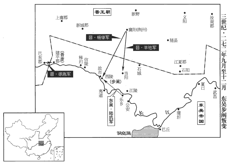 11吳陸抗‹时驻乐乡,湖北松滋东北›聞步闡叛,亟遣將軍左奕、吾彥等討之。帝遣荊州刺史楊肇迎闡於西陵,車騎將軍羊祜帥步軍出江陵‹湖北江陵›,巴東‹重庆奉节东›監軍徐胤帥水軍擊建平以救闡。帥,讀曰率。陸抗敕西陵諸軍築嚴圍,自赤谿至于故市,水經註:江水出西陵峽,東南流,逕故城洲。洲北附岸洲頭曰郭洲,長二里,廣一里,上有步闡故城,方圓稱洲,周廻略满,故城洲上城周里,闡父騭所築也。又東逕陸抗故城。今峽州遠安縣在江北,有孤山,有陸抗故城,有舟山,時有赤氣,意赤溪當出於舟山,故市即步騭故城,所居成市,而闡別築城,故曰故市。內以圍闡,外以禦晉兵,晝夜催切,切,迫也。如敵已至,眾甚苦之。諸將諫曰:「今宜及三軍之銳,急攻闡,比晉救至,必可拔也,比,必寐翻。何事於圍,以敝士民之力!」抗曰:「此城處勢既固,處,昌呂翻。糧穀又足,且凡備禦之具,皆抗所宿規,抗先嘗督西陵。今反攻之,不可猝拔。北兵至而無備,表里受難,難,乃旦翻。何以禦之!」諸將皆欲攻闡,抗欲服眾心,聽令一攻,果無利。圍備始合,而羊祜兵五萬至江陵‹湖北江陵›。諸將咸以抗不宜上,自樂鄉而西赴西陵為上。上,時掌翻。抗曰:「江陵城固兵足,無可憂者。假令敵得江陵,必不能守,所損者小。若晉據西陵,則南山群夷皆當擾動,其患不可量也!」乃自帥眾赴西陵。南山,謂江南諸山,群夷所依阻。量,音良。帥,讀曰率。