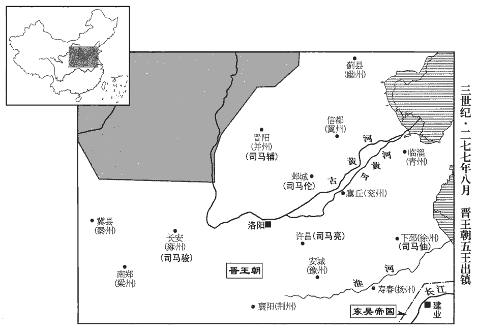 7衛將軍楊珧yáo等建議,以為「古者封建諸侯,所以藩衛王室;今諸王公皆在京師,非扞城之義。又,異姓諸將居邊,宜參以親戚。」考異曰:職官志以為珧與荀勗以齊王攸有時望,懼太子有後難,故建此議,使諸王之國。帝初未之察,於是下詔議其制。按勗傳有異議,又,時齊王不之國,疑此說非實。今不取。帝‹司马炎,时年四十二›乃詔諸王各以戶邑多少為三等,大國置三軍五千人,次國二軍三千人,小國一軍一千一百人;時以平原、汝南、琅邪、扶風、齊為大國,梁、趙、樂安、燕、安平、義陽為次國,餘國為小國。諸王為都督者,各徙其國使相近。八月,癸亥‹二十一›,徙扶風王亮為汝南王,出為鎮南大將軍,都督豫州諸軍事;琅邪王倫為趙王,督鄴城守事;勃海王輔為太原王,監并州諸軍事;以東莞王伷在徐州,徙封琅邪王;莞,音官。伷,音胄。汝陰王駿在關中,徙封扶風王;又徙太原王顒yóng為河間王;汝南王柬為南陽王。輔,孚之子;顒,孚之孫也。顒yóng,魚容翻。其無官者,皆遣就國。諸王公戀京師,皆涕泣而去。又封皇子瑋為始平王,允為濮陽王,該為新都王,遐為清河王。