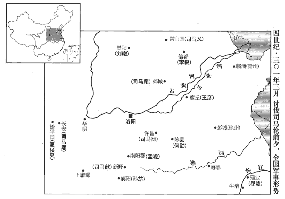 5齊王冏謀討趙王倫,未發,會離狐‹河北东明›王盛、離狐縣,前漢屬東郡,後漢、晉屬濟陰郡,唐天寶元年,改為南華縣,屬鄆yùn州。潁川‹河南禹县›處穆《晉書》作「王處穆」。【章:孔本「處」上正有「王」字;張校同。】聚眾於濁澤‹河南临颍›,濁澤在潁川長社縣。百姓從之,日以萬數。倫以其將管襲為齊王軍司,討盛、穆,斬之。冏因收襲,殺之,考異曰:齊王冏傳曰:「冏潛與盛、穆謀起兵誅倫,未發,恐事泄,乃與襲殺穆,送首於倫,以安其意。」今從三十國春秋。與豫州刺史何勗、龍驤將軍董艾等起兵,遣使告成都王穎、河間王顒、常山王乂及南中郎將新野公歆,晉志曰:四中郎將,并後漢置;武帝以來,四中郎將或領刺史,或持節為之。歆xīn,扶風王駿之子也。移檄征、鎮、州、郡、縣、國,征、鎮,四征、四鎮,居方面者。稱:「逆臣孫秀,迷誤趙王,當共誅討。有不從命者,誅及三族。」