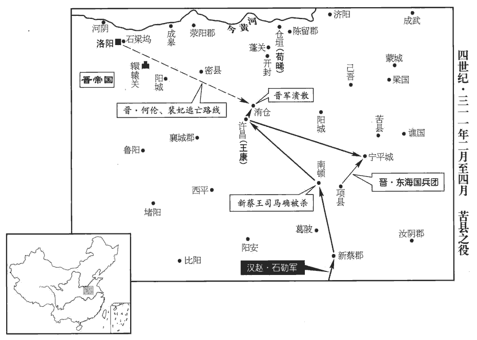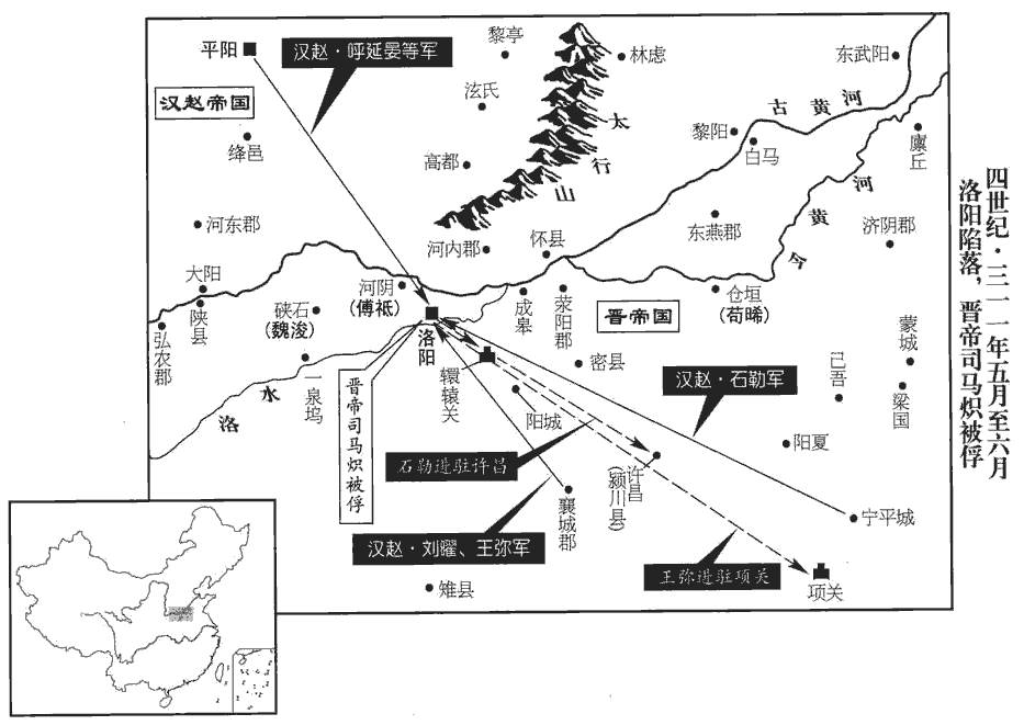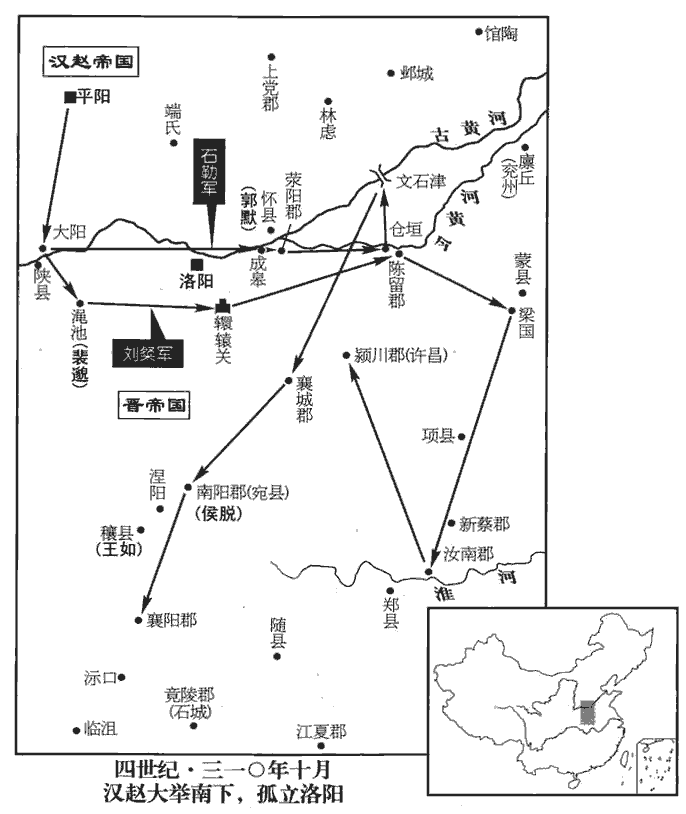 16冬,十月,漢河內王粲、始安王曜及王彌帥眾四萬寇洛陽,石勒帥騎二萬會粲于大陽‹山西平陆›,敗監軍裴邈于澠池‹河南省洛宁县西北›,帥,讀曰率。敗,補邁翻;下同。澠,彌兗翻。遂長驅入洛川‹洛水流域,河南黄河以南›。粲出轘轅‹河南偃师东南›,掠梁‹河南商丘›、陳‹河南开封东›、汝‹河南息县›、潁‹河南许昌市东›間。轘,音還。勒出成皋關‹河南省荥阳县西北汜水镇›,晉志,河南成皋縣有關。壬寅‹十三›,圍陳留太守王讚於倉垣‹河南开封东北›,為讚所敗,退屯文石津‹河南省滑县西南古黄河渡口›。據帝紀,文石津在河北,又據永嘉六年,勒自葛陂北行,至東燕,使孔萇自文石津潛渡枋頭,取向水船,則文石津在東燕之東北,枋頭之東南。