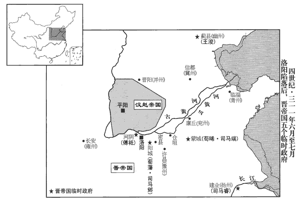 10東海孝獻王越既與苟晞有隙,事始上卷永嘉二年。河南尹潘滔、尚書劉望等復從而譖之。復,扶又翻。晞怒,表求滔等首,揚言:「司馬元超為宰相不平,東海王越,字元超。使天下淆亂,苟道將豈可以不義使之!」乃移檄諸州,自稱功伐,陳越罪狀。帝‹司马炽,本年三十八岁›亦惡越專權,多違詔命;所留將士何倫等,抄掠公卿,逼辱公主;抄,楚交翻。密賜晞手詔,使討之。晞數與帝文書往來,惡,烏路翻。數,所角翻。越疑之,使遊騎於成皋‹河南省荥阳县西北汜水镇›間伺之,騎,奇寄翻;下同。伺,相吏翻。果獲晞使及詔書。使,疏吏翻。乃下檄罪狀晞,以從事中郎楊瑁為兗州刺史,瑁mào,莫報翻。使與徐州刺史裴盾共討晞。盾,徒損翻。晞遣騎收潘滔,滔夜遁,得免;執尚書劉曾、侍中程延,斬之。越憂憤成疾,以後事付王衍;三月,丙子‹十九›,薨于項‹河南省沈丘县›,考異曰:帝紀:「五年正月,帝密詔苟晞討越。乙未,越遣楊瑁、裴盾共擊晞。三月,戊午,詔下越罪狀,告方鎮討之,以晞為大將軍。丙子,越薨。」晞傳:「晞移告諸州,陳越罪狀。帝惡越專權,乃詔晞施檄六州,協同大舉。晞移諸征鎮,帝又密詔晞討越。晞復上表稱李初至,奉被手詔,卷甲長驅,次于倉垣。五年,帝復詔晞,陳越罪惡,詔至之日,宣告天下,率齊大舉。晞表稱,輒遣王讚將兵詣項。越使騎於成皋間獲晞使,遂大搆嫌隙。」晉春秋:「五年,正月,上遣李初詔晞討越。」按:越若已得晞使,則帝亦不能自安,潘滔、何倫等不容晏然在洛。且滔等未去,則帝亦不敢明言使晞討越。年月事迹,既前後參差如此,今并置於越薨之時,庶為不失。祕不發喪。眾共推衍為元帥,帥,所類翻。衍不敢當;以讓襄陽王范,范亦不受。范,瑋之子也。於是衍等相與奉越喪還葬東海‹山东省郯城县›。何倫、李惲等聞越薨,奉裴妃及世子毗自洛陽東走,城中士民爭隨之。帝追貶越為縣王,以苟晞‹时驻仓垣河南省开封市东北›為大將軍、大都督,督青、徐、兗、豫、荊、揚六州諸軍事。