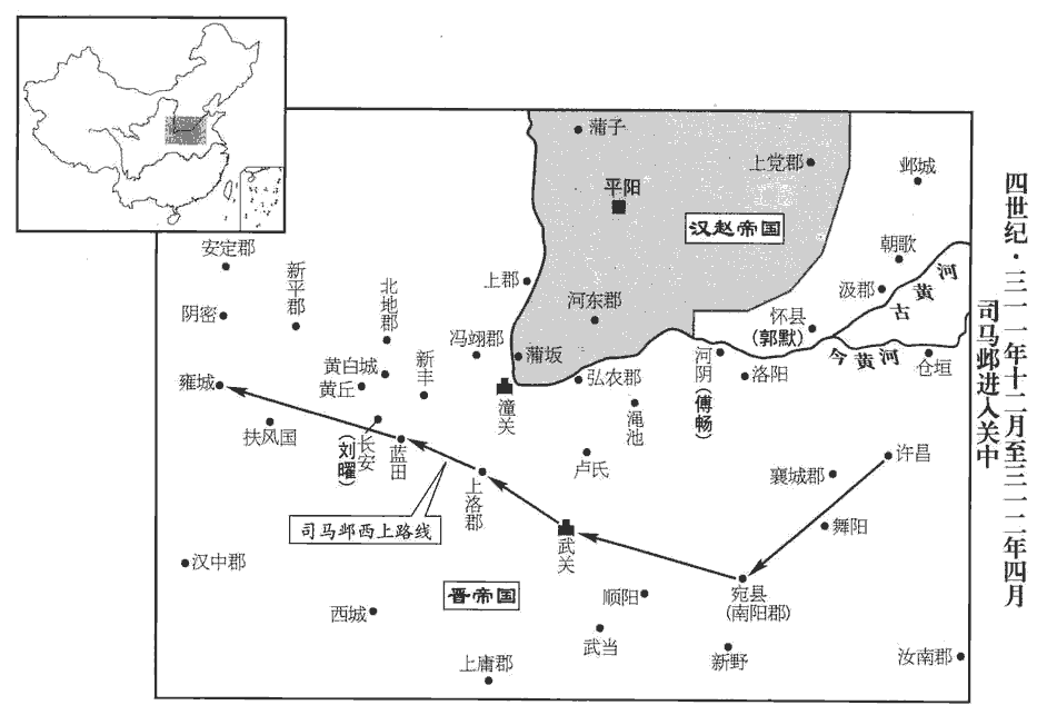 24初,南陽王模以從事中郎索綝為馮翊太守。綝,靖之子也。模死,綝與安夷護軍金城‹甘肃兰州东›麴允、頻陽‹陕西富平东北›令梁肅,俱奔安定‹甘肃省镇原县东南曙光乡›。索,昔各翻,姓也。綝,丑林翻。頻陽縣,屬馮翊郡,秦厲公置。應劭曰,在頻水之陽。杜佑曰,京兆同官縣,漢祋duì祤yǔ縣,晉為頻陽縣。時綝等自京兆南山奔安定。安夷護軍蓋亦置司於長安。時安定太守賈疋yǎ與諸氐、羌皆送任子於漢,綝等遇之於陰密‹甘肃灵台西南›,擁還臨涇‹安定郡郡政府所在,甘肃镇原东南曙光乡›,陰密縣,屬安定郡,商之密國,詩所謂「密人不恭,敢距大邦」者也。臨涇縣時為安定郡治所。與疋謀興復晉室,疋從之。乃共推疋為平西將軍,率眾五萬向長安。雍州刺史麴qū特、新平‹陕西彬县›太守竺恢皆不降於漢,特與恢同守新平。雍,於用翻。聞疋起兵,與扶風‹陕西省眉县›太守梁綜帥眾十萬會之。帥,讀曰率。綜,肅之兄也。漢河內王粲在新豐‹陕西临潼东北›,使其將劉雅、趙染攻新平‹陕西彬县›,不克。索綝救新平,大小百戰,雅等敗退。中山王曜與疋等戰於黃丘‹陕西省泾阳县西北›,黃丘,在馮翊雲陽縣黃嶔山下。曜眾大敗。疋遂襲漢梁州刺史彭蕩仲,殺之。蕩仲,安定盧水胡也,據後蕩仲子天護,漢以為涼州刺史,此「梁」當作「涼」。麴特等擊破粲於新豐‹陕西临潼东北›,粲還平陽。於是疋等兵勢大振,關西胡、晉翕然響應。