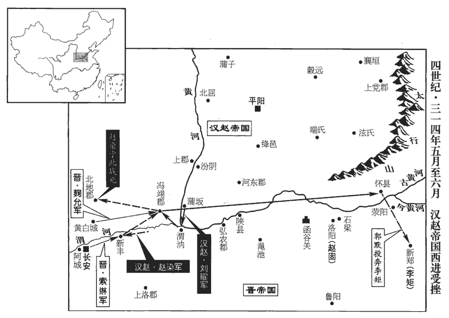 13漢中山王曜、趙染寇長安,六月,曜屯渭汭ruì‹渭水注入黄河处›,春秋左氏傳曰:虢公敗戎于渭汭。杜預曰:水之隈曲曰汭;王肅曰:汭,入也。呂忱chén曰:汭者,水相入也。即渭水入河處。汭,儒稅翻。染屯新豐‹陕西临潼东北›,索綝將兵出拒之。索,昔各翻。綝,丑林翻。染有輕綝之色,長史魯徽曰:「晉之君臣,自知強弱不敵,將致死於我,不可輕也。」染曰:「以司馬模之強,吾取之如拉朽;事見八十七卷懷帝永嘉五年。拉,落合翻。索綝小豎,豈能汙吾馬蹄、刀刃邪!」晨,帥輕騎數百逆之,汙,烏故翻。帥,讀曰率;下同。曰:「要當獲綝而後食。」綝與戰于城西,新豐‹陕西临潼东北›城西也。染兵敗而歸。悔曰:「吾不用魯徽之言以至此,何面目見之!」先命斬徽,徽曰:「將軍愚愎以取敗,乃復忌前害勝,復,扶又翻;下同。愎,弼力翻。忌前,忌人在前;害勝,害勝己者。誅忠良以逞忿,猶有天地,將軍其得死於枕席乎!」‹司马邺,本年十五岁›詔加索綝驃騎大將軍、尚書左僕射、錄尚書,承制行事。驃,匹妙翻。