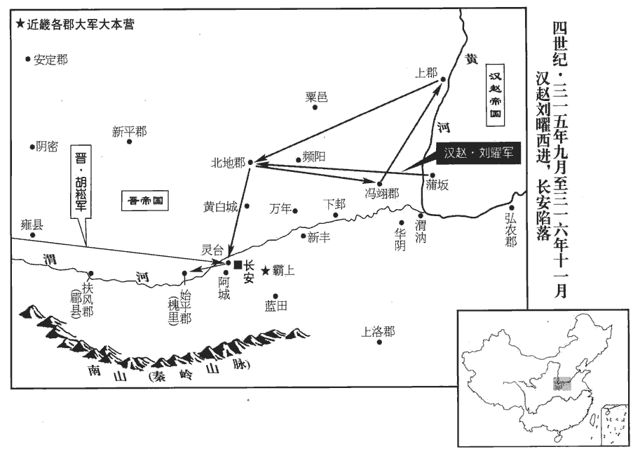 19漢大司馬曜寇北地‹陕西耀县›,詔以麴允為大都督驃騎將軍以禦之。驃,匹妙翻。騎,奇寄翻。冬,十月,以索綝為尚書僕射、都督宮城諸軍事。曜進拔馮翊‹陕西大荔›,太守梁肅奔萬年‹陕西临潼西北›。秦櫟陽縣,漢高祖改曰萬年,屬馮翊,晉屬京兆。曜轉寇上郡‹陕西省韩城市›。麴允去黃白城‹陕西三原›,軍于靈武‹陕西咸阳东›,漢北地郡之靈武縣也。以兵弱,不敢進。