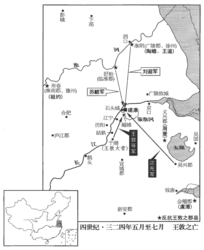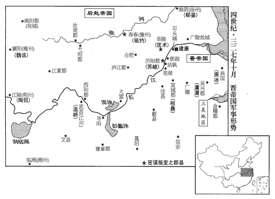8初,王導輔政,以寬和得眾。及庾亮用事,任法裁物,頗失人心。豫州‹府设寿春安徽省寿县›刺史祖約,自以名輩不後郗、卞,名為一時所稱,輩以年齒為等。而不豫顧命,又望開府復不得,晉制:四征、四鎮大將軍乃得開府。約平西將軍耳,烏得望開府邪!復,扶又翻。及諸表請多不見許,遂懷怨望。及遺詔褒進大臣,又不及約與陶侃,二人皆疑庾亮刪之。刪,削除也。歷陽‹安徽和县›內史蘇峻,有功於國,謂破沈充、錢鳳也。威望漸著,有銳卒萬人,器械甚精,朝廷以江外寄之;而峻頗懷驕溢,有輕朝廷之志,招納亡命,眾力日多,皆仰食縣官,運漕相屬,仰,牛向翻。屬,之欲翻。稍不如意,輒肆忿言。亮既疑峻、約,又畏侃之得眾,八月,以丹楊尹溫嶠為都督江州諸軍事、江州刺史,鎮武昌;尚書僕射王舒為會稽‹绍兴›內史,會,工外翻。以廣聲援;又修石頭以備之。亮修石頭,適以資蘇峻拒義師耳。