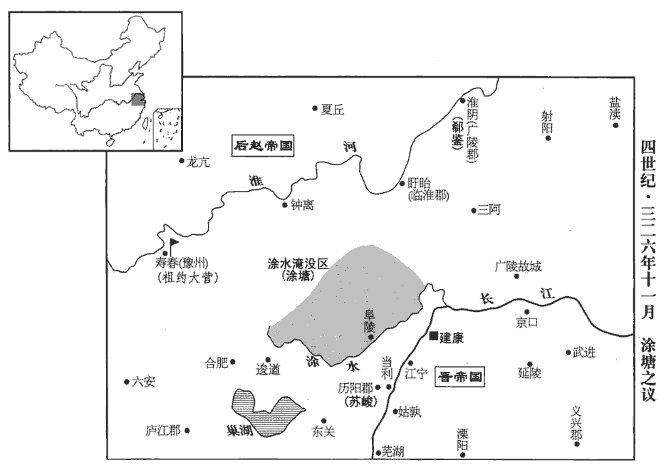 13十一月,後趙石聰攻壽春‹安徽寿县›,祖約屢表請救,朝廷不為出兵。為,于偽翻。聰遂寇逡遒‹安徽省肥东县东›、阜陵‹安徽全椒东南›,二縣皆屬淮南郡。師古曰:逡,音峻;遒,音才由翻。春秋:公會吳于槖皋;杜預云:淮南逡遒縣。劉昫曰:唐廬州慎縣,漢逡遒縣地。殺掠五千餘人。建康大震,詔加司徒導大司馬、假黃鉞、都督中外諸軍事以禦之,軍于江寧‹江苏省江宁县西南江宁乡›。蘇峻遣其將韓晃擊石聰,走之;導解大司馬。朝議又欲作涂塘‹切断滁河›以遏胡寇,祖約曰:「是棄我也!」益懷憤恚。作涂塘,則壽春在涂塘之外。朝,直遙翻。涂,讀曰滁。恚,於避翻。