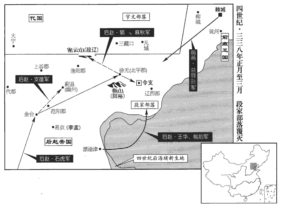 趙王虎進屯金臺‹河北省易县东南›。按水經註:金臺在涿郡故安縣,有金臺陂,臺在陂北十餘步,即燕昭王築以事郭隗之臺。支雄長驅入薊‹北京›,薊,音計。段遼所署漁陽‹北京密云›、上谷‹河北怀来›、代郡‹河北蔚县›守相皆降,取四十餘城。北平‹河北遵化›相陽裕帥其民數千家登燕山‹河北省玉田县北›以自固。五代志,北平無終縣有燕山。守,手又翻。相,息亮翻。燕,於賢翻。諸將恐其為後患,欲攻之。虎曰:「裕儒生,矜惜名節,恥於迎降耳,降,戶江翻;下同。無能為也。」遂過之,至徐無。徐無縣,屬北平郡,其地在唐薊州玉田縣界。段遼以其弟蘭既敗,不敢復戰,帥妻子、宗族、豪大千餘家,豪大,猶言豪帥也。是時東北夷率謂主帥為大,部帥曰部大,城主曰城大是也。棄令支,奔密雲山‹北京密雲南横山›。水經註:密雲戍在禦夷鎮東南九十里,鮑丘水逕其西。唐檀州治密雲縣,西南去范陽二百里。又據晉紀云,遼奔于平崗。蓋密雲山在漢平岡縣界。宋白曰:檀州密雲縣,本漢虒sī奚縣,西南至幽州百九十里,西至媯guī川二百五十里,東北至長城障塞百一十里,東南至薊州百九十里。將行,執慕容翰手泣曰:「不用卿言,自取敗亡;我固甘心,令卿失所,深以為愧。」翰北奔宇文氏‹内蒙古老哈河上游›。