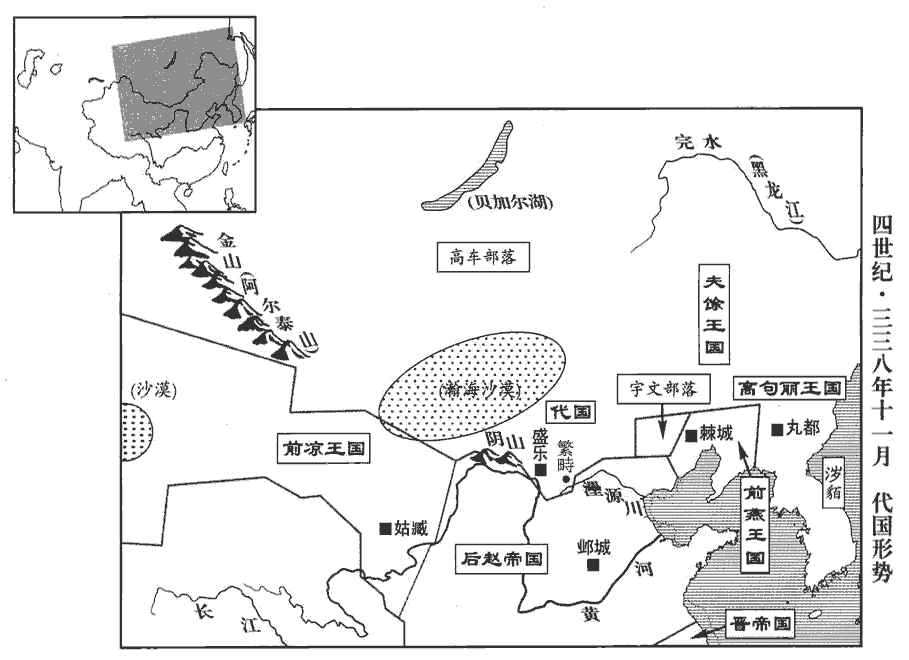 初,代王猗盧既卒,國多內難,部落離散,事見八十九卷愍帝建興四年。難,乃旦翻。拓跋氏寖衰。及什翼犍立‹本年十九岁›,雄勇有智略,能脩祖業,國人附之;始置百官,分掌眾務。以代‹河北省蔚县›人燕鳳為長史,許謙為郎中令。始制反逆、殺人、姦盜之法,號令明白,政事清簡,無繫訊連逮之煩,百姓安之。於是東自濊貊‹朝鲜半岛东北部›,濊huì,音穢。貊mò,莫白翻。西及破落那‹即大宛,首都贵山城中亚纳曼干市西北卡散赛城›,新唐書西域傳曰:寧遠者,本拔汗那,或曰潑汗,元魏時謂之破落那,去長安八千里,居西鞬城,在真珠河之北。南距陰山,北盡沙漠,率皆歸服,有眾數十萬人。史言代復強。