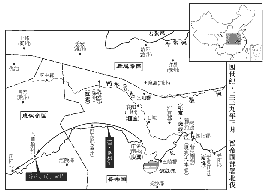 3征西將軍庾亮欲開復中原,表桓宣為都督沔北前鋒諸軍事、司州刺史,鎮襄陽‹湖北襄樊›;沔,彌兗翻。又表其弟臨川‹江西臨川›太守懌yì為監梁•雍二州諸軍事、梁州刺史,鎮魏興‹陕西安康›;自李矩以司州刺史退屯卒于魯陽,司州已寄治荊州界;今始以司州治襄陽。周訪領梁州,治襄陽;今司州既治襄陽,故梁州治魏興。監,工銜翻;下同。西陽‹湖北省黄州市›太守翼為南蠻校尉,領南郡太守,鎮江陵‹湖北江陵›;皆假節。又請解豫州,以授征虜將軍毛寶。‹司马衍,本年十九岁›詔以寶監揚州之江西諸軍事、豫州刺史,與西陽太守樊峻帥精兵萬人戍邾城‹湖北省黄州市›。邾城在江北,漢江夏郡邾縣之故城也。楚宣王滅邾,徙其君於此,因以為名,今黃州城是也。杜佑曰:黃州東南百二十里,臨江與武昌相對,有邾城,此言唐黃州治所也。西陽縣,漢屬江夏郡,魏分屬弋陽郡,晉惠帝分弋陽為西陽國,江左廢國為郡。帥,讀曰率;下同。以建威將軍陶稱為南中郎將、江夏相,入沔中。稱將二百人下見亮,亮鎮武昌,稱自上流下見之。相,息亮翻。將,即亮翻。亮素惡稱輕狡,數稱前後罪惡,收而斬之。亮素怨陶侃,而稱又間亮於王導,蓋以私忿殺之。素惡,烏路翻。數,所具翻。後以魏興‹陕西安康›險遠,命庾懌徙屯半洲‹江西九江西北二十千米长江中小岛›;半洲在江州界,康帝時,褚裒póu為江州刺史,鎮半洲。更以武昌太守陳囂為梁州刺史,趣漢中‹陕西漢中›。趣,七喻翻。遣參軍李松攻漢巴郡‹重庆›、江陽‹四川泸州›。夏,四月,執漢荊州刺史李閎、巴郡太守黃植送建康。漢置荊州於巴郡。漢主壽‹本年四十岁›以李奕為鎮東將軍,代閎守巴郡‹重庆›。