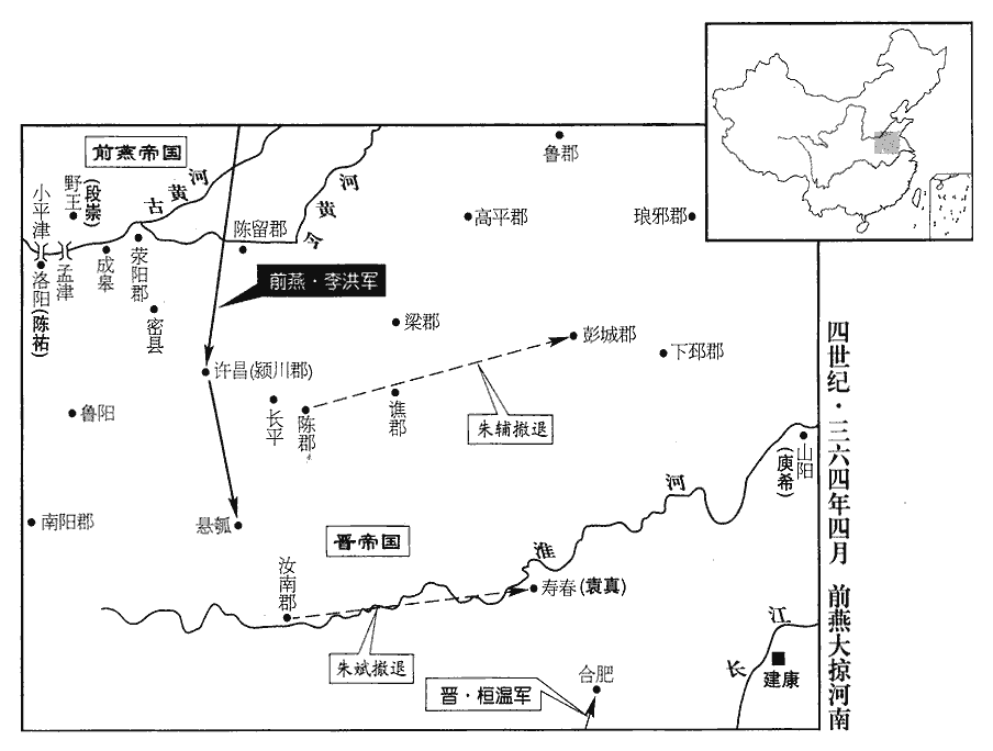 3燕‹都邺城河北省临漳县西南邺镇›豫州刺史孫興請攻洛陽‹河南省洛阳市东白马寺东›,曰:「晉將陳祐弊卒千餘,介守孤城,不足取也!」將,即亮翻。介,如字,獨也;又音戛jiá。燕人從其言,遣寧南將軍呂護屯河陰‹河南孟津东北›。