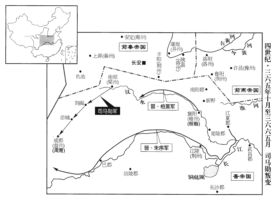 1春,三月,荊州‹府设江陵湖北省江陵县›刺史桓豁‹时驻襄阳湖北省襄类市›使督護桓羆攻南鄭‹陕西汉中›,討司馬勳。
