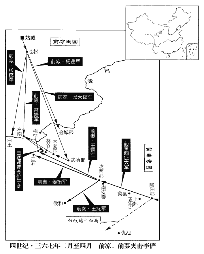 3秦‹都西安›輔國將軍王猛、隴西‹甘肃隴西›太守姜衡、南安‹甘肃隴西东南›太守南安邵羌、揚武將軍姚萇等帥眾萬七千討斂岐。三月,張天錫‹本年二十二岁›遣前將軍楊遹yù向金城‹甘肃兰州›,征東將軍常據向左南‹青海化隆西›,張軌置左南縣,屬晉興郡。闞駰十三州志曰:石城西一百四十里,有左南城,河水逕其南,曰左南津。遹,音聿yù。游擊將軍張統向白土‹青海循化›,晉志,白土縣屬金城郡。十三州志:左南津西六十里有白土城,城在大河之北,為緣河濟渡之地。天錫自將三萬人屯倉松‹甘肃武威南›,倉松縣,自漢以來屬武威郡,後涼呂光改曰昌松縣。將,即亮翻。以討李儼。斂岐部落先屬姚弋仲,聞姚萇至,皆降;王猛遂克略陽‹甘肃天水东›,斂岐奔白馬‹甘肃成县›。白馬,即武都白馬氐之地。秦王堅‹本年三十岁›以萇為隴東‹甘肃平凉西北›太守。