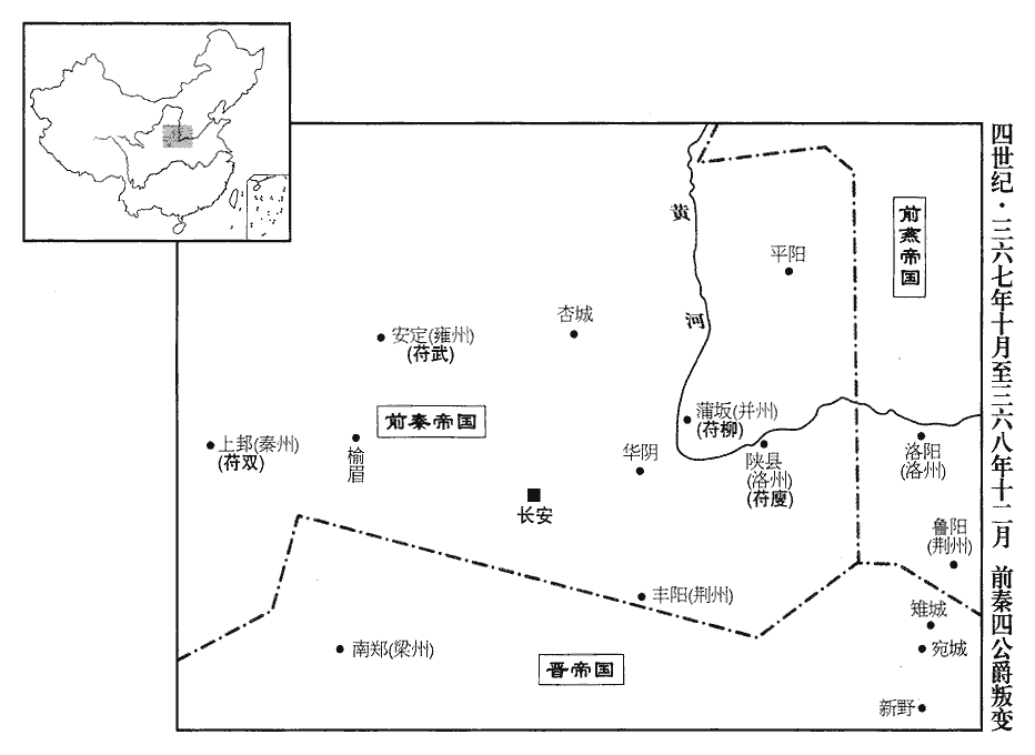 10秦淮南公幼之反也,征東大將軍、并州牧、晉公柳,征西大將軍、秦州刺史趙公雙,皆與之通謀;秦王堅以雙母弟至親,柳,健之愛子,隱而不問。柳、雙復與鎮東將軍、洛州刺史魏公廋sōu,安西將軍、雍州刺史燕公武謀作亂,復,扶又翻。秦并州刺史治蒲阪‹山西永济›,秦州刺史治上邽‹甘肃天水›,洛州刺史治陝‹河南三门峡›,雍州刺史治安定‹府临泾,甘肃镇原东南曙光乡›。廋、武,皆健子也。廋,疏鳩翻。鎮東主簿南安‹甘肃陇西东南›姚眺眺,他弔翻。諫曰:「明公以周、邵之親,受方面之任,國家有難,當竭力除之,況自為難乎!」難,乃旦翻。廋不聽。堅聞之,徵柳等詣長安。冬,十月,柳據蒲阪‹山西永济›,雙據上邽‹甘肃天水›,廋據陝城‹河南省三门峡市›,武據安定‹府设临泾·甘肃省镇原县东南曙光乡›,皆舉兵反。果如王猛之言。堅遣使諭之曰:「吾待卿等,恩亦至矣,何苦而反!今止不徵,卿宜罷兵,各定其位,一切如故。」各齧niè梨以為信。皆不從。梨肉脆而齧之易入,以喻親戚離叛,則國力脆弱,將為敵人所乘,故齧梨付使者,賜柳等以為信也。使,疏吏翻。齧,魚結翻。