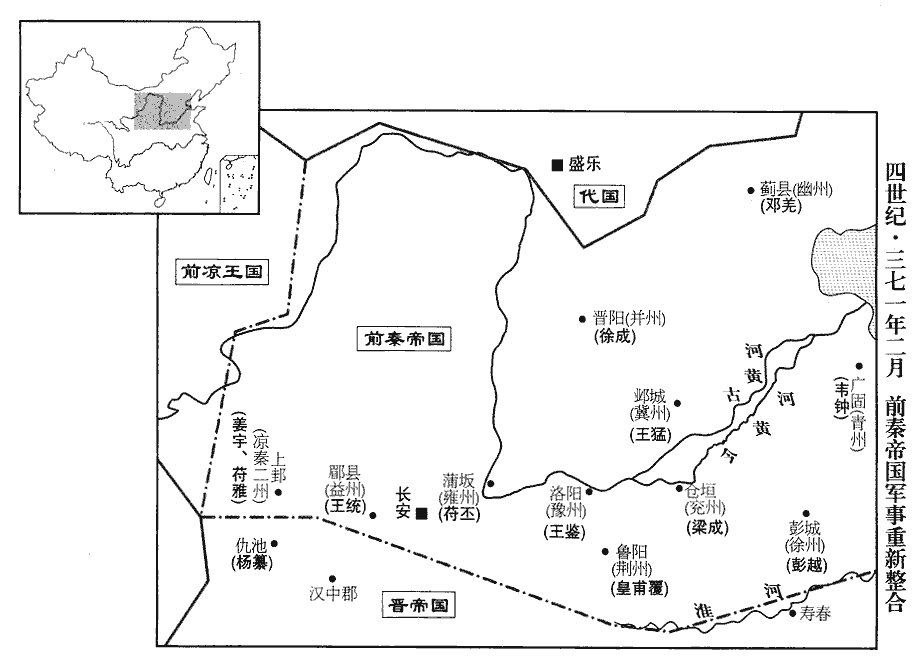 3二月,秦以魏郡‹河北临漳西南邺镇›太守韋鍾為青州刺史,青州刺史治廣固‹山东青州›。中壘將軍梁成為兗州刺史,射聲校尉徐成為并州刺史,武衛將軍王鑒為豫州刺史,左將軍彭越為徐州刺史,太尉司馬皇甫覆為荊州刺史,晉志曰:秦既滅燕,以兗州刺史鎮倉垣‹河南开封东北›,并州刺史鎮晉陽‹山西太原›,豫州刺史鎮洛陽‹河南洛阳东白马寺东›,徐州刺史鎮彭城‹江苏徐州›。秦初以荊州刺史鎮豐陽,後移襄陽。余按此時秦未得襄陽,蓋仍燕之舊鎮魯陽‹河南鲁山›也。屯騎校尉天水‹甘肃天水›姜宇為涼州刺史,扶風‹陕西眉县›內史王統為益州刺史,涼州屬張天錫。益州,晉土也。秦蓋置涼州於天水界,置益州於扶風界。校,戶教翻。秦州刺史、西縣侯雅為使持節、都督秦•晉•涼•雍州諸軍事、秦州牧,雅,苻氏也。前此未有晉州;涼之張氏分西平界置晉興郡,秦蓋於此置晉州也。雍,於用翻。吏部尚書楊安為使持節、都督益•梁州諸軍事、梁州刺史。堅欲進圖梁、益,故置梁、益二州刺史。楊安既克仇池,始加督南秦州,鎮仇池。使,疏吏翻。復置雍州,治蒲阪‹山西永济›;秦省雍州見上卷上年。復,扶又翻。雍,於用翻。阪,音反。以長樂公丕為使持節、征東大將軍、雍州刺史。樂,音洛。使,疏吏翻。成,平老之子;統,擢之子也。穆帝永和十年,王擢降秦。堅以關東初平,守令宜得人,令王猛以便宜簡召英俊,補六州守令,授訖,言臺除正。奏上秦朝,除為正官也。嗚呼!荀卿子有言:兼并易也,堅凝之難。以苻堅之明,王猛之略,簡召六州英俊以補守令,然鮮卑乘亂一呼,翕然為燕,以此知天下之勢,但觀人心向背何如耳。