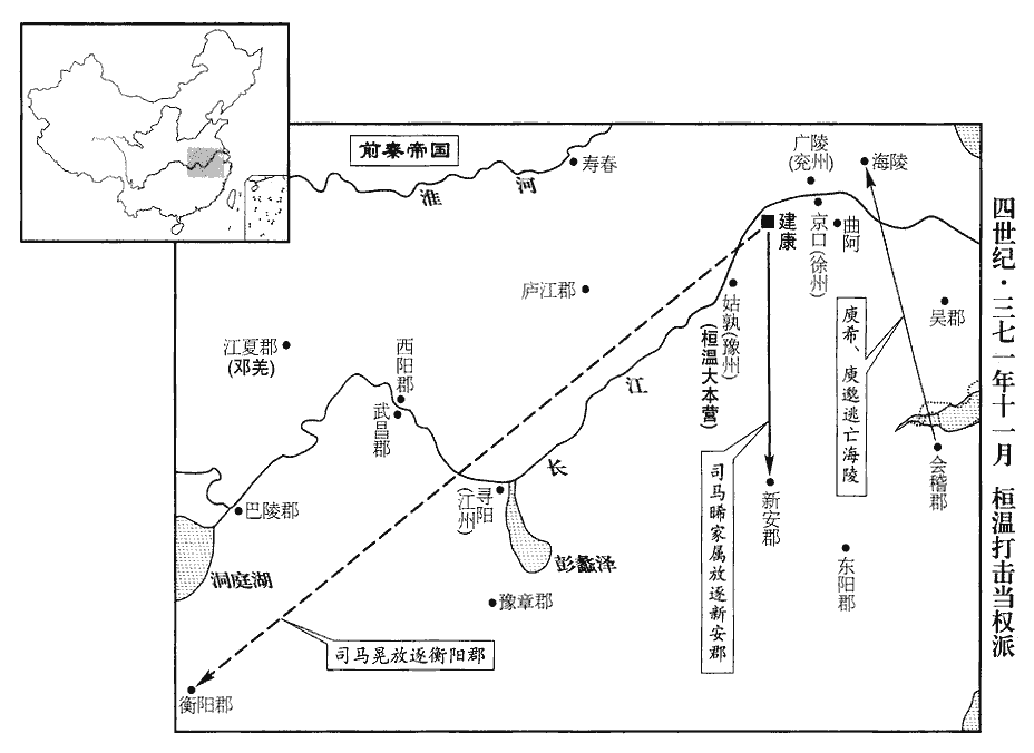初,殷浩卒,大司馬溫使人齎書弔之。浩子涓不答,涓,圭淵翻。亦不詣溫,而與武陵王晞遊。廣州‹府番禺,广东广州›刺史庾蘊,希之弟也,素與溫有隙。溫惡殷、庾宗強,欲去之。惡,烏路翻。去,羌呂翻。辛亥‹十七›,使其弟祕逼新蔡王晃晃父邈,本汝南王祐之子也,嗣新蔡王後。詣西堂叩頭自列,西堂,太極殿西堂也。自列,自陳列其事。稱與晞及子綜、著作郎殷涓、太宰長史庾倩、掾曹秀、舍人劉彊、散騎常侍庾柔等謀反;帝對之流涕,溫皆收付廷尉。倩、柔,皆蘊之弟也。倩,千甸翻。掾,于絹翻。癸丑‹十九›,溫殺東海王三子及其母。即田氏、孟氏及所生三男也。甲寅‹二十›,御史中丞譙王恬承溫旨,請依律誅武陵王晞。詔曰:「悲惋惶怛,惋,烏貫翻。非所忍聞,況言之哉!其更詳議!」恬,承之孫也。譙王氶死於王敦之難。「承」,當作「氶」,音註見前。乙卯‹二十一›,溫重表固請誅晞,詞甚酷切。帝乃賜溫手詔曰:「若晉祚靈長,公便宜奉行前詔;如其大運去矣,請避賢路。」溫覽之,流汗變色,乃奏廢晞及其三子,家屬皆徙新安郡‹浙江淳安›。吳孫權分丹楊立新都郡,武帝太康元年,更名新安郡,唐為歙shè州,今之徽州。丙辰‹二十二›,免新蔡王晃為庶人,徙衡陽‹湖南湘潭西南古城乡›,吳孫亮分長沙西部都尉置衡陽郡,今之衡州。殷涓、庾倩、曹秀、劉彊、庾柔皆族誅,庾蘊飲酖死。蘊兄東陽‹浙江金华›太守友子婦,桓豁之女也,故溫特赦之。庾希聞難,難,乃旦翻。與弟會稽【章:十二行本「稽」下有「王」字;乙十一行本同;孔本同。】參軍邈及子攸之逃于海陵‹江苏泰州›陂澤中。海陵縣,前漢屬臨淮郡,後漢、晉屬廣陵郡,今泰州即其地。