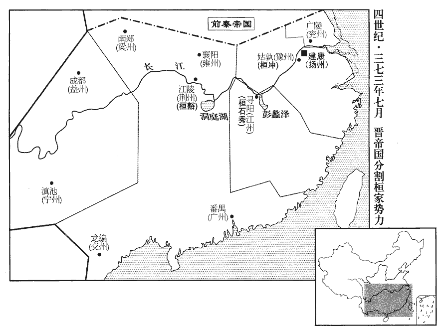 8冬,秦王堅‹本年三十六岁›使益州‹府郿县,陕西眉县›刺史王統、祕書監朱肜róng帥卒二萬出漢川,肜,余沖翻。帥,讀曰率;下同。前禁將軍毛當、秦置左、右、前、後四禁將軍。鷹揚將軍徐成帥卒三萬出劍門‹四川剑阁北剑门关›,入寇梁、益;梁州刺史楊亮帥巴獠萬餘拒之,蜀先無獠,李勢之時,始自山出。獠,盧皓翻。戰于青谷‹陕西洋县西北›。新唐志:洋州真符縣,本華陽縣,開元十八年,析興道置。天寶八載,開清水谷路。興道縣,即興勢之地。亮兵敗,奔固西城‹陕西安康›。西城縣,漢屬漢中郡,魏、晉屬魏興郡。奔固者,奔西城以自固也。肜遂拔漢中‹陕西汉中›。徐成攻劍閣,【章:十二行本「閣」作「門」;乙十一行本同。】克之。楊安進攻梓潼‹四川绵阳›,梓潼太守周虓xiāo固守涪城,遣步騎數千送母、妻自漢水趣江陵‹湖北江陵›,朱肜邀而獲之,此漢水,蓋蜀人所謂西漢水也,與涪水會,至渝州入江,順江而下,則達江陵。然朱肜克漢中,因得邀獲虓母、妻,則又似自漢中之漢水趣江陵。但秦兵已至梓潼,自涪以北,皆為秦有,虓母、妻安能越劍閣,取漢水路而趣江陵乎!意謂當以此漢水為西漢水。虓xiāo,虛交翻。涪,音浮。趣,七喻翻。虓遂降於安。降,戶江翻;下同。十一月,安克梓潼‹四川绵阳›。梓潼縣,漢屬廣漢郡。劉蜀分為梓潼郡,治涪。潼,音同。荊州刺史桓豁遣江夏‹湖北云梦›相竺瑤救梁、益;瑤聞廣漢太守趙長戰死,引兵退。益州刺史周仲孫勒兵拒朱肜于緜竹‹四川德阳北黄许镇›,聞毛當將至成都‹四川成都›,仲孫帥騎五千奔于南中‹云南›。秦遂取梁、益二州,邛‹四川西昌›、莋zuó‹四川汉源›、夜郎‹贵州关岭›皆附於秦。邛,渠容翻。莋zuó,才各翻。秦王堅以楊安為益州牧,鎮成都;毛當為梁州刺史,鎮漢中;姚萇為寧州刺史,屯墊江‹重庆合川›;墊,音疊。王統為南秦州刺史,鎮仇池‹甘肃西和南›。