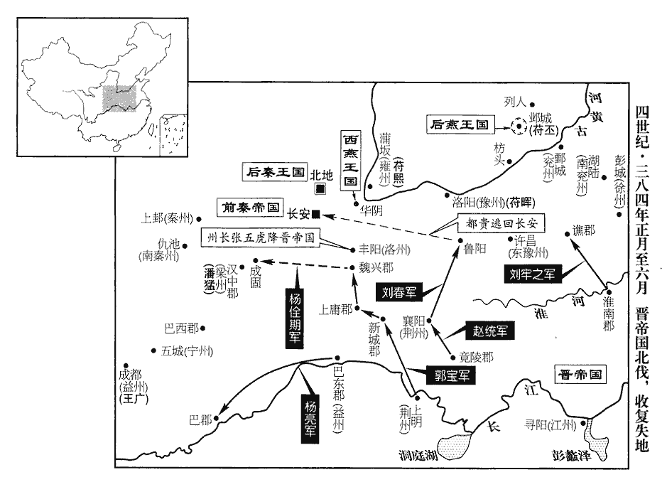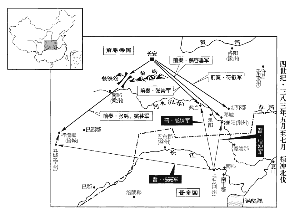 3夏,五月,桓沖帥眾十萬伐秦,攻襄陽‹湖北襄樊›;帥,讀曰率。遣前將軍劉波等攻沔‹汉水›北諸城;沔,彌兗翻。輔國將軍楊亮攻蜀,拔五城‹四川中江›,進攻涪城‹四川绵阳›;涪,音浮。鷹揚將軍郭銓攻武當‹湖北丹江口西北›。六月,沖別將攻萬歲‹湖北穀城境›、筑陽‹湖北穀城›,拔之。萬歲,城名,蓋近筑陽。筑陽縣,漢屬南陽郡,晉屬順陽郡;春秋穀伯之國也;唐為襄州穀城縣。師古曰:筑,音逐。秦王堅‹本年四十六岁›遣征南將軍鉅鹿公叡、冠軍將軍慕容垂等帥步騎五萬救襄陽‹湖北襄樊›,冠,故玩翻。騎,奇寄翻。兗州刺史張崇救武當‹湖北丹江口西北›,後將軍張蚝、步兵校尉姚萇救涪城‹四川绵阳›;蚝,七吏翻。萇,仲良翻。叡軍于新野‹河南新野›,垂軍于鄧城‹湖北襄樊北›。鄧城縣,屬襄陽郡,蓋晉置也。桓沖退屯沔南。秋,七月,郭銓及冠軍將軍桓石虔敗張崇于武當,敗,補邁翻。掠二千戶以歸。鉅鹿公叡遣慕容垂為前鋒,進臨沔水。垂夜命軍士人持十炬,繫于樹枝,光照數十里。沖懼,退還上明。沖鎮上明見上卷二年。張蚝出斜谷‹陕西太白西南褒河山谷›;斜,余遮翻。谷,音浴,又古祿翻。楊亮引兵還。沖表其兄子石民領襄城【張:「城」作「陽」。】太守,戍夏口‹湖北武汉›。沖自求領江州刺史;‹司马昌明,本年二十二岁›詔許之。