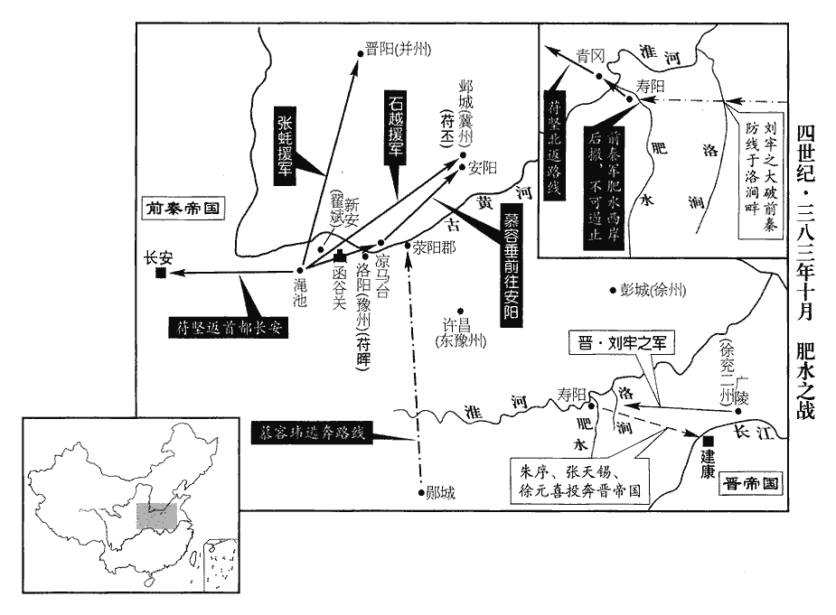 甲子‹八›,堅發長安,戎卒六十餘萬,騎二十七萬,旗鼓相望,前後千里。九月,堅至項城‹河南沈丘›,涼州‹河西走廊·甘肃省中部西部›之兵始達咸陽‹陕西咸陽›,蜀、漢之兵方順流而下,幽、冀之兵至于彭城‹江苏徐州›,東西萬里,水陸齊進,運漕萬艘。艘,蘇遭翻。陽平公融等兵三十萬,先至潁口‹颍水注入淮河处·安徽颖上东南正阳关›。潁水入淮之口也。地理志:潁水出陽城縣陽乾山,東至下蔡入淮。