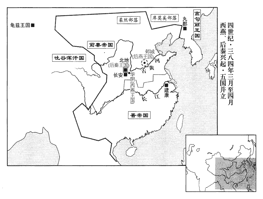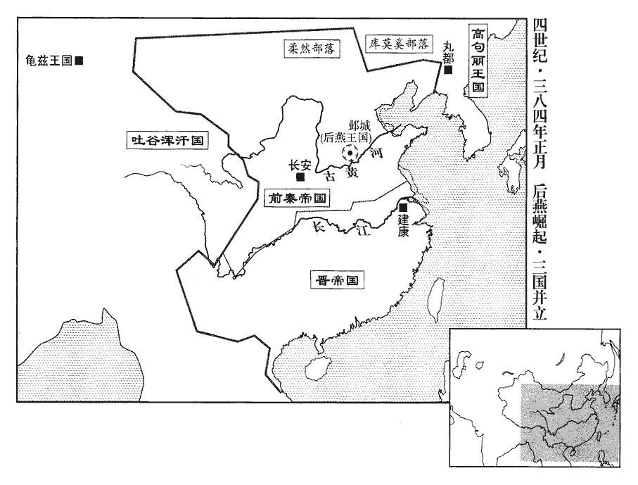 1春,正月,秦呂光發長安‹西安›,以鄯善‹新疆若羌›王休密馱、車師前部‹吐鲁番›王彌窴為鄉導。鄯,上扇翻。馱,唐何翻。窴tián,徒賢翻,又唐見翻。鄉,讀曰嚮。