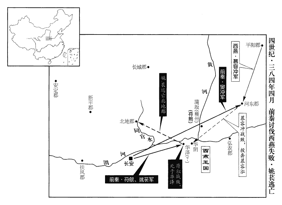 後秦王萇進屯北地‹陕西耀县›,姚萇書後秦,以別於苻秦也。秦華陰‹陕西華陰›、北地、新平‹陕西彬县›、安定‹甘肃镇原东南曙光乡›羌胡降之者十餘萬。