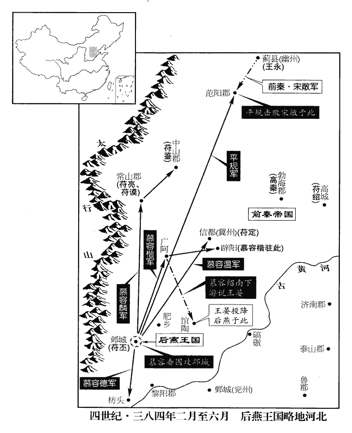 1春,正月,乙酉朔‹一›,秦長樂公丕‹时驻邺城河北省临漳县西南邺镇›大會賓客,樂,音洛。請慕容農不得,始覺有變;遣人四出求之,三日,乃知其在列人‹河北肥乡东北›,已起兵矣。