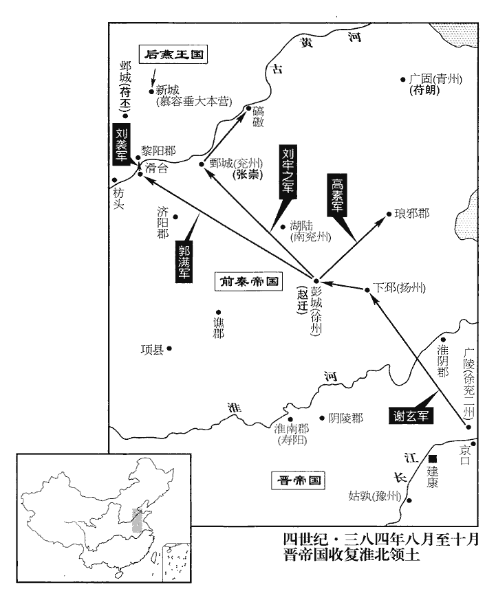太保安奏請乘苻氏傾敗,開拓中原,以徐、兗二州刺史謝玄為前鋒都督,帥豫州刺史桓石虔伐秦。帥,讀曰率。玄至下邳‹江苏睢宁北古邳镇›,秦徐州刺史趙遷棄彭城‹江苏徐州›走,玄進據彭城。此晉自淮、泗北向之師也。