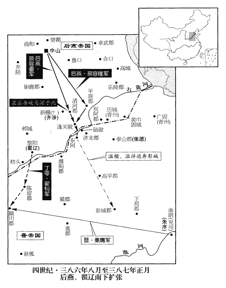 3燕主垂‹慕容垂,本年六十二岁›觀兵河上,韋昭曰:觀,示也,陳兵以示威武。觀,古玩翻。高陽王隆曰:「溫詳之徒,皆白面儒生,烏合為群,徒恃長河‹黄河›以自固;若大軍濟河,必望旗震壞,不待戰也。」垂從之。戊午‹二十一›,遣鎮北將軍蘭汗、護軍將軍平幼於碻qiāo磝‹山东茌平西南›西四十里濟河,隆以大眾陳於北岸。陳,讀曰陣。溫攀、溫楷果走趣城,蓋趣東阿城‹山东阳谷东北阿城镇›也。趣,七喻翻。平幼追擊,大破之。詳夜將妻子奔彭城,其眾三萬餘戶皆降於燕。降,戶江翻。垂以太原王楷為兗州刺史,鎮東阿。