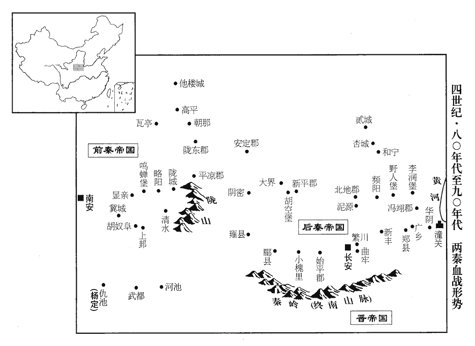 後秦征西將軍姚碩德為楊定所逼,退守涇陽‹甘肃平凉西北›。涇陽縣,前漢屬安定郡,後漢、晉省,秦屬隴東郡。杜佑曰:漢涇陽縣在今平涼郡界涇陽故城是。定與秦魯王纂共攻之,戰于涇陽,碩德大敗。後秦主萇自陰密‹甘肃灵台西南›救之,纂退屯敷陸‹陕西洛川东南›。陰密縣,屬安定郡,殷時密國也。敷陸,唐坊州鄜fū城縣,即其地。