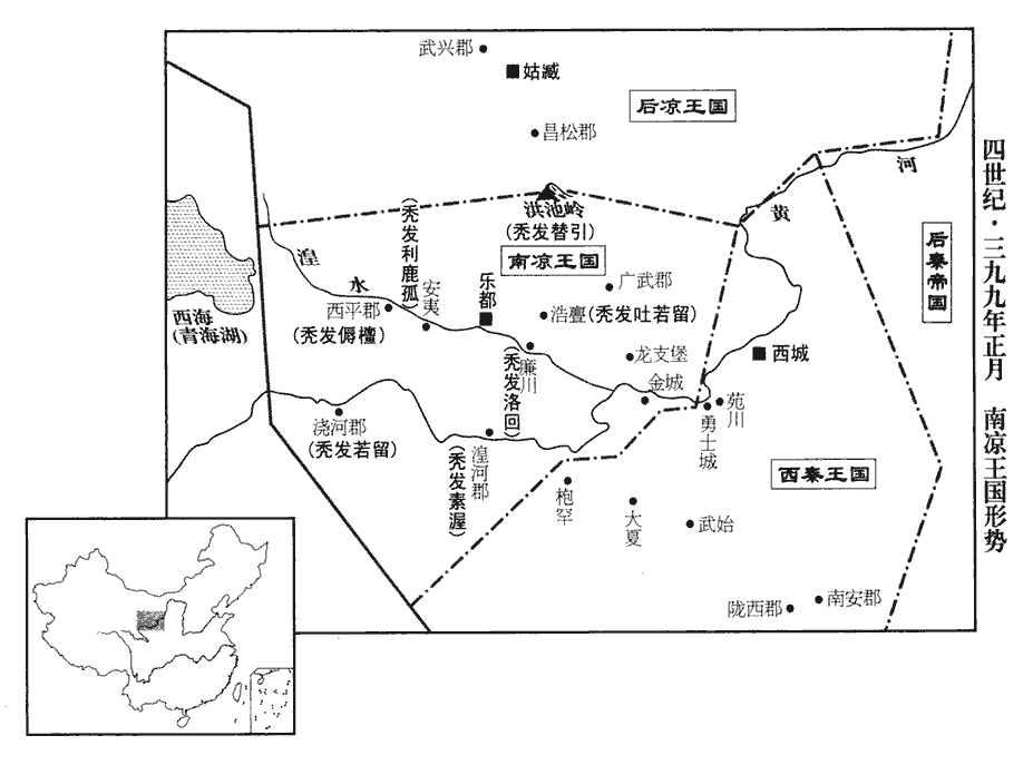 11涼王纂將伐武威王利鹿孤,中書令楊穎諫曰:「利鹿孤上下用命,國未有釁,不可伐也。」不從。利鹿孤使其弟傉檀拒之,傉nù,奴沃翻。夏,四月,傉檀敗涼兵於三堆‹青海乐都北›,三堆,在浩亹mén河‹大通河›南。敗,補邁翻。斬首二千餘級。