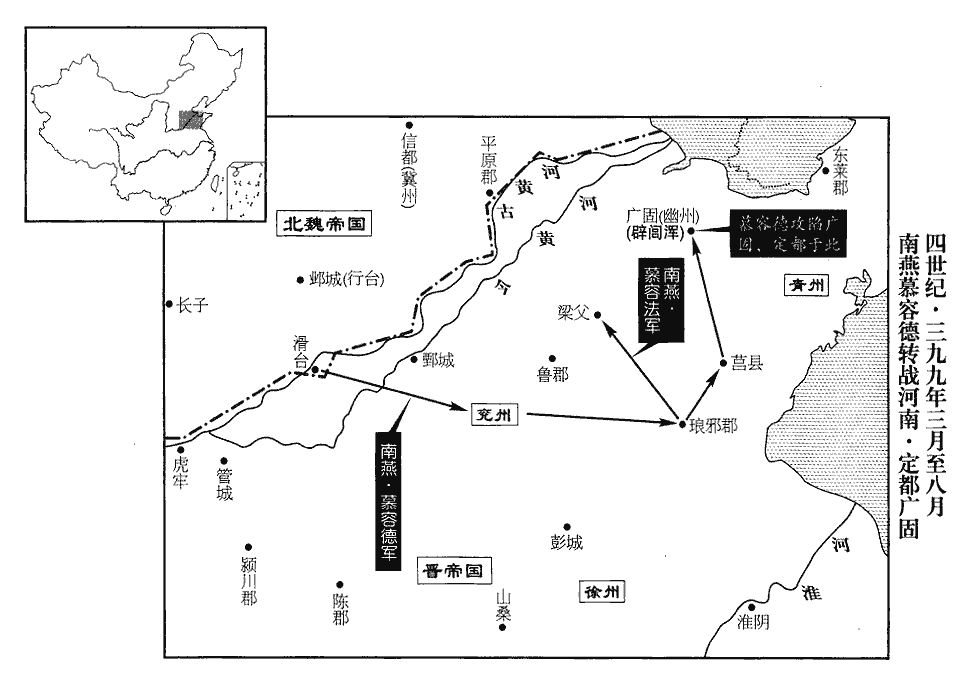 〖译文〗 南燕右卫将军慕容云斩杀了李辩,率领将士的家属共二万多口人冲出滑台城,去投奔慕容德。慕容德打算进攻滑台,部将韩范说:“过去魏人是客人,我们是主人;现在我们是客人,魏人却变成了主人。我们军中人人都非常害怕,不可以再让他们去打仗了。不如先据守一个地方,自己重新创立根本基业,然后才能再筹划考虑发展壮大进取的事情。”部将张华说:“彭城是西楚霸王的旧都城,可以把它攻下来占据它。”但是北地王慕容钟等人都劝说慕容德进攻滑台。尚书潘聪说:“滑台是一个四通八达的地方,北有魏,南有晋,西有秦,居住在那里没有一天感到是安全的。彭城地广人稀,一片平原,没有什么险要可以据守。而且那里是晋的旧有重镇,未必很容易就可以攻取下来。这地方又距长江、淮河很近,夏季、秋季降雨很多。乘舟在水上作战,那是吴地之人所最擅长的,而恰恰又是我们的短处。青州既拥有二千里的肥沃土地,又拥有十多万精锐的部队,左边有紧挨着大海的富饶,右边有依靠高山大河的险要,广固城是当年曹嶷所兴筑,地势险峻,足可以作为帝王的都城。三齐地方的英才俊杰,希望得到一个圣明的君主,拥戴他在世上建立宏伟的功业,已经有很长时间了。青州刺史辟闾浑以前也曾是燕的臣子,现在应该派遣能言善辩之士赶到他那里游说,紧接着再派遣大军进逼,如果他不听从我们的奉劝,击败他并夺取青州也不过像弯腰拣草那么容易罢了。得到那里之后,封锁关隘,养精蓄锐,等待时机而有所建树,这才是陛下的关中、河内呀!”慕容德犹豫再三,委决不下。一个叫竺朗的和尚一向善于占卜征候,慕容德遣使牙门苏抚前去探问,竺朗说:“我恭敬地看了他们提出的这三种策略,潘尚书的建议,才是兴邦立国的言论。而且今年年初的时候,彗星起自奎宿、娄宿,其尾扫过虚宿、危宿。彗星的出现,乃是消除陈腐、新机将布的星象,奎宿、娄宿天区为鲁国疆域,虚宿、危宿天区为齐国疆域。应该先去夺取兖州,再去安抚琅邪,到秋天的时候再向北攻占齐地,这是上天的旨意呀。”苏抚又偷偷地问他燕国的寿命如何,竺朗根据《周易》推算之后说:“燕国将在庚戌年衰亡,寿命为一纪,并可以把王位传给儿子。”苏抚回去向慕容德汇报,慕容德才率领大军向南进发,兖州以北偏远地区的郡县都投降了他。慕容德分别设置地方官员安抚百姓,严禁军队到处虏掠抢夺。百姓们非常高兴,一路上不断地有人送来慰劳大军的牛肉美酒。