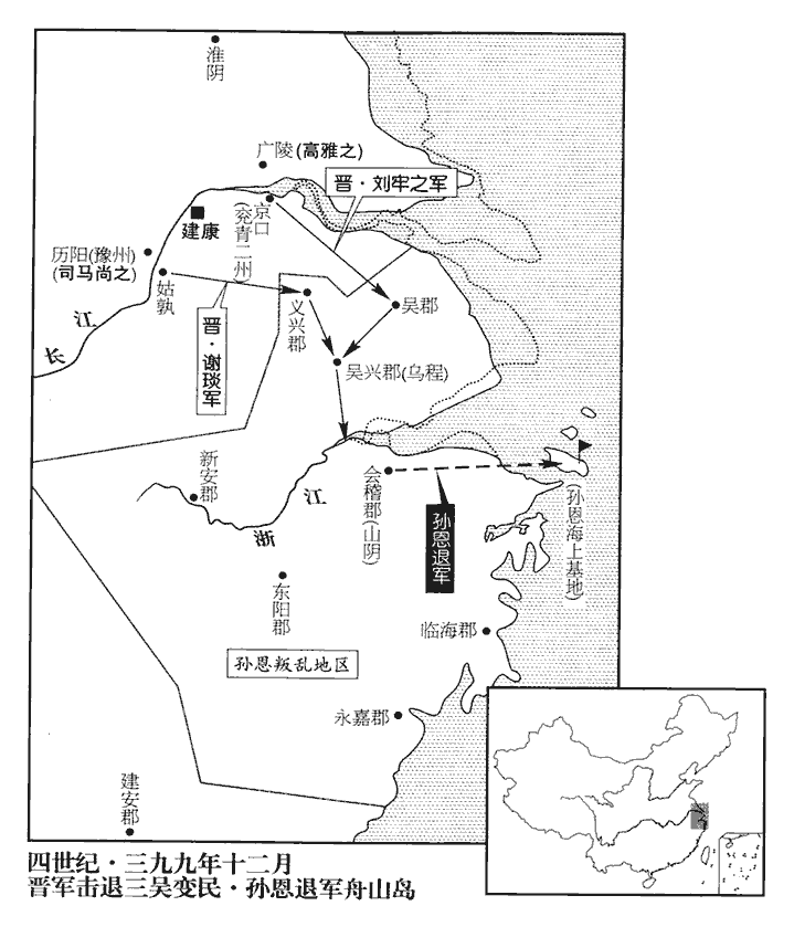 孫恩因民心騷動,自海島帥其黨殺上虞令,上虞縣‹浙江上虞›,自漢以來屬會稽郡,西北距郡城百餘里。帥,讀曰率。遂攻會稽‹浙江绍兴›。會稽內史王凝之,羲之之子也,世奉天師道,天師道,即張道陵之所傳也。會,工外翻。不出兵,亦不設備,日於道室稽顙跪呪zhòu。道室,奉道之室也。稽,音啟。官屬請出兵討恩,凝之曰:「我已請大道,借鬼兵守諸津要,各數萬,賊不足憂也。」及恩漸近,乃聽出兵,恩已至郡下。甲寅‹二›,恩陷會稽,凝之出走,恩執而殺之,并其諸子。凝之妻謝道蘊,奕之女也,聞寇至,舉措自若,命婢肩輿,抽刀出門,手殺數人,乃被執。被,皮義翻。吳國‹苏州›內史桓謙、臨海‹浙江台州西北章安镇›太守新秦王崇、晉書作「新蔡王崇」。崇,汝南王祐之曾孫,自其祖父以來,嗣新蔡國封。「秦」,當作「蔡」。義興‹江苏宜兴›太守魏隱皆棄郡走。於是會稽謝鍼、吳郡陸瓌、吳興‹浙江湖州›丘尫、鍼zhēn,其廉翻。瓌guī,姑回翻。尫wāng,烏光翻。義興許允之、臨海周冑、永嘉‹浙江温州›張永等及東陽‹浙江金华›、新安‹浙江淳安›凡八郡人,一時起兵,殺長吏以應恩,旬日之中,眾數十萬。吳興太守謝邈、永嘉太守司馬逸、嘉興公顧胤、南康公謝明慧、黃門郎謝沖、張琨、中書郎孔道等皆為恩黨所殺。邈、沖,皆安之弟子也。時三吳承平日久,民不習戰,故郡縣兵皆望風奔潰。