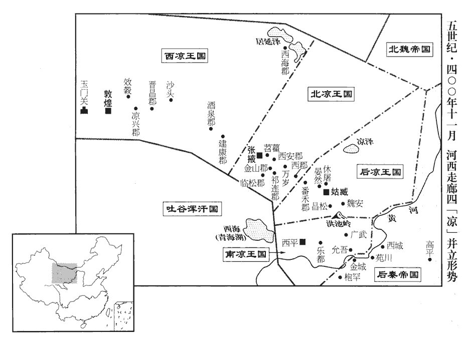 12初,隴西‹甘肃陇西›李暠好文學,有令名。暠hào,古老翻。好,呼到翻。嘗與郭黁及同母弟敦煌宋繇同宿,黁nún,奴昆翻。敦,徒門翻。黁起謂繇曰:「君當位極人臣,李君終當有國家,有騍kè馬生白額駒,騍馬,牝馬也。騍,音課。晉書作「騧guā」。此其時也。」及孟敏為沙州刺史,以暠為效穀‹甘肃敦煌西›令;效穀縣,自漢以來,屬敦煌郡。師古曰:本魚澤障也。桑欽說:孝武元封六年,濟南崔不意為魚澤尉,教力田,以勤效得穀,因立為縣名。後周併入敦煌縣。宋繇事北涼王業,為中散常侍。以中散大夫常侍左右也。散,悉亶翻。孟敏卒,敦煌護軍馮翊‹陕西大荔›郭謙、沙州治中敦煌索仙等索,昔各翻。以暠溫毅有惠政,推為敦煌太守。敦,徒門翻。暠初難之。會宋繇自張掖告歸,謂暠曰:「段王無遠略,終必無成。兄忘郭黁之言邪?白額駒今已生矣。」暠乃從之,遣使請命於業;使,疏吏翻。業因以暠為敦煌太守。