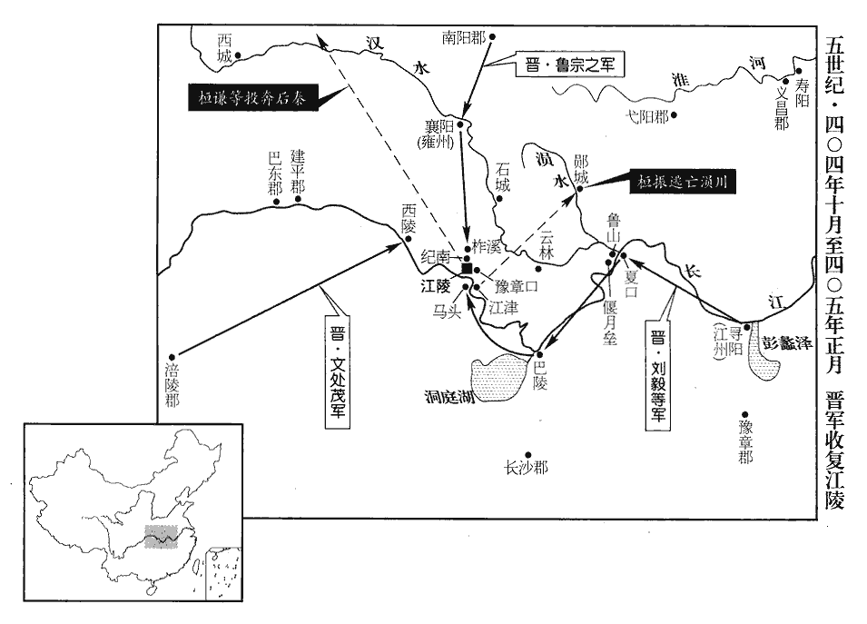 1春,正月,南陽‹河南南阳›太守扶風‹陕西眉县›魯宗之起兵襲襄陽‹湖北襄樊›,桓蔚走江陵‹湖北江陵›。蔚,紆勿翻。己丑‹七›,劉毅等諸軍至馬頭‹湖北公安东北›。桓振挾帝‹时年二十四›出屯江津‹江陵东南十公里›,江津戍在江陵,南臨江滸。荊州記曰:江陵縣東三里有津鄉。水經註:江陵城南有馬牧城。此洲始自枚回下迄于此,長七十餘里,洲上有奉城,江津長所治。遣使求割江、荊二州,奉送天子;毅等不許。辛卯‹九›,宗之擊破振將溫楷于柞溪‹江陵北十公里›,水經註:柞溪水出江陵縣北,蓋諸池散流,咸所會合,積以成川,東流逕魯宗之壘南,又東注船官湖。將,即亮翻。柞,才各翻,又音作。進屯紀南‹江陵北五公里纪南城›。郡國志:江陵縣北十餘里有紀南城。振留桓謙、馮該守江陵,引兵與宗之戰,大破之。劉毅等擊破馮該於豫章口‹江陵东十公里长江口岸›,水經註:江水過江陵而東,得豫章口,夏水所通也;西北有豫章岡,蓋因岡而得名,其地去江陵城二十里。桓謙棄城走。毅等入江陵,執卞範之等,斬之。桓振還,望見火起,知城已陷,其眾皆潰,振逃于溳yún川。水經註:溳水出漢南陽郡蔡陽縣東南大洪山,東南流,過隨縣西,又南過江夏安陸縣西,又東南入于夏。溳,音云。