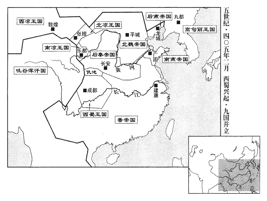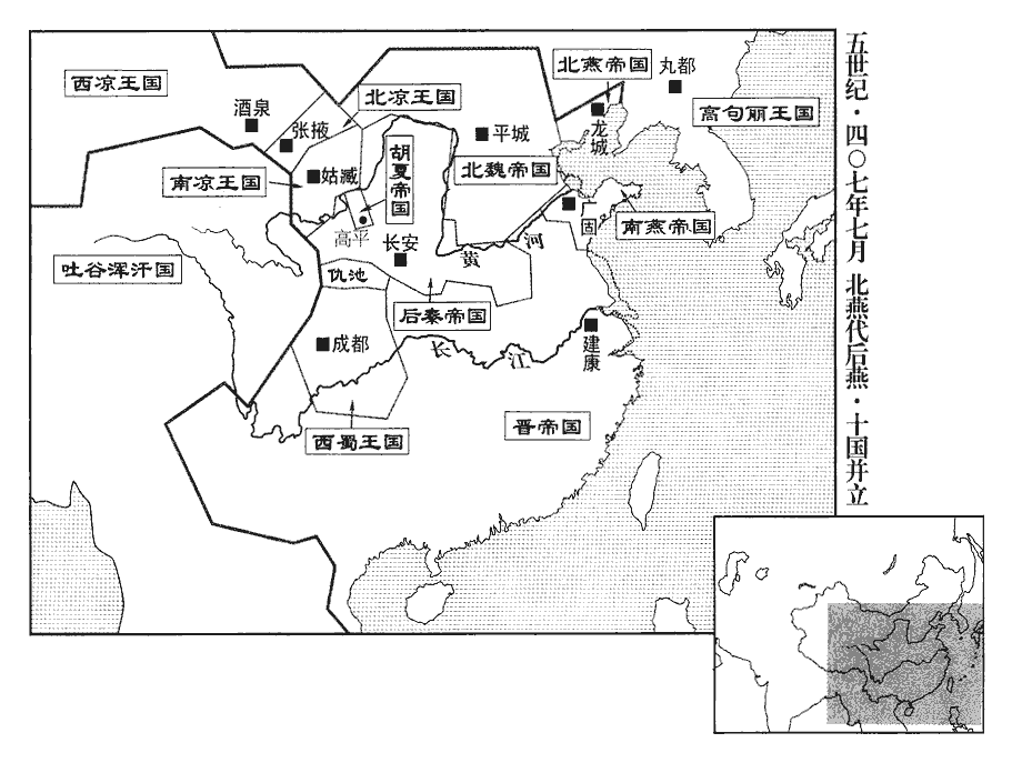 25夏王勃勃破鮮卑薛千等三部,「薛千」,晉書載記作「薛千」,蜀本作「薛干」。降其眾以萬數,降,戶江翻。進攻秦三城‹陕西延安›已北諸戍,斬秦將楊丕、姚石生等。諸將皆曰:「陛下欲經營關中,宜先固根本,使人心有所憑係。高平‹宁夏固原›山川險固,土田饒沃,可以定都。」勃勃曰:「卿知其一,未知其二。吾大業草創,士眾未多;姚興亦一時之雄,諸將用命,關中未可圖也。我今專固一城,彼必并力於我,眾非其敵,亡可立待。不如以驍騎風馳,將,即亮翻。驍,堅堯翻。騎,奇寄翻。出其不意,救前則擊後,救後則擊前,使彼疲於奔命,我則游食自若。不及十年,嶺北‹陕西礼泉九嵕山北›、河東‹山西西南›盡為我有。待興既死,嗣子闇弱,徐取長安‹西安›,在吾計中矣。」於是侵掠嶺北,嶺北諸城,門不晝啟。興乃歎曰:「吾不用黃兒之言,以至於此!」黃兒,興弟邕小字也。
