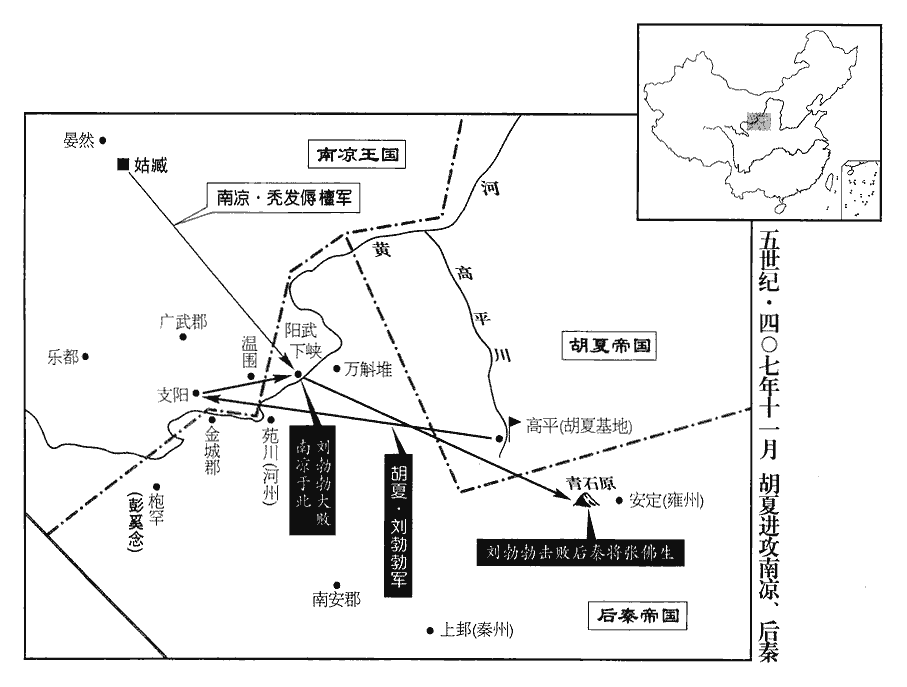 勃勃求婚於禿髮傉檀,傉檀不許。十一月,勃勃帥騎二萬擊傉檀,至于支陽‹甘肃永登南›,枝陽縣,漢屬金城郡,晉張寔分屬廣武郡。劉昫曰:唐蘭州廣武縣,漢枝陽縣。杜佑曰:唐會州會寧縣,漢枝陽縣。殺傷萬餘人,驅掠二萬七千餘口、牛馬羊數十萬而還。還,從宣縣,又如字。傉檀帥眾追之,帥,讀曰率。焦朗曰:「勃勃天姿雄健,御軍嚴整,未可輕也。不如從溫圍‹甘肃皋兰›北渡,趣萬斛堆‹甘肃靖远›,溫圍,水名。水經:河水北過武威媼圍縣東北。溫圍其即漢之媼圍縣歟?趣,七喻翻。阻水結營,扼其咽喉,咽,音煙。百戰百勝之術也。」傉檀將賀連怒曰:「勃勃敗亡之餘,烏合之眾,柰何避之,示之以弱,宜急追之!」傉檀從之。勃勃於陽武下峽‹甘肃靖远境›鑿凌埋車以塞路,凌,力證翻,冰也,又閭承翻。鑿冰塞路,置兵死地,使人自為戰。塞,悉則翻。勒兵逆擊傉檀,大破之,追奔八十餘里,殺傷萬計,名臣勇將死者什六七。將,即亮翻。傉檀與數騎奔南山,漢書地理志:武威郡蒼松縣有南山、松陝。余謂此南山自羌中連延西平、金城之界,東出秦、雍,至于終南,皆此山也。傉檀所奔,枝陽之南山也。幾為追騎所得。幾,居希翻。騎,奇寄翻。勃勃積尸而封之,號曰髑髏臺。髑,徒谷翻。髏,音婁。勃勃又敗秦將張佛生於青石原‹甘肃镇原西南›,敗,補邁翻。後漢書西羌傳:安定有青石岸。安定,唐之涇州;涇州有青石嶺。俘斬五千餘人。