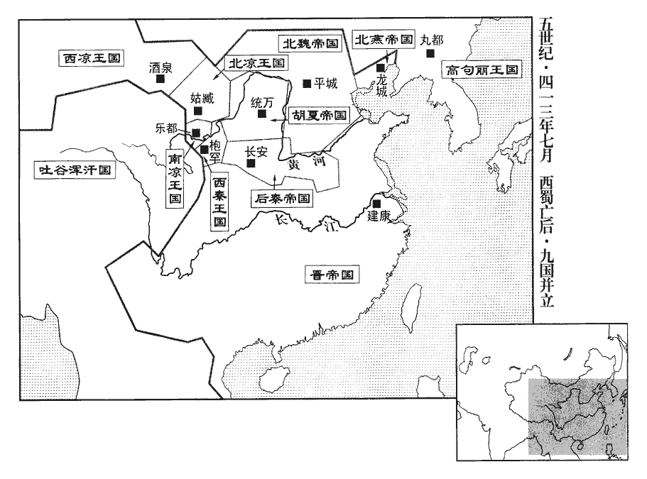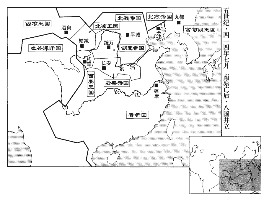 2夏‹都统万,陕西靖边北白城子›王勃勃‹时年三十四›侵魏河東‹山西夏县›蒲子‹山西隰县›。