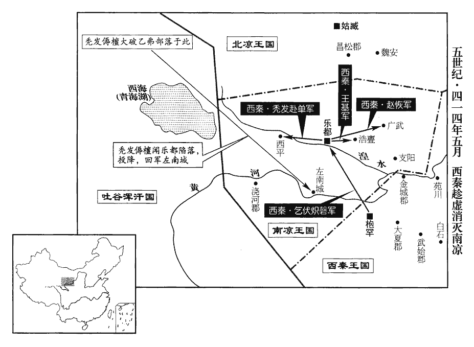 一夕,城潰,熾磐入樂都,遣平遠將軍捷虔帥騎五千追傉檀,以鎮南將軍謙屯為都督河右諸軍事、涼州刺史,鎮樂都;捷虔、謙屯,皆乞伏種。禿髮赴單為西平太守,鎮西平‹青海西宁›,以趙恢為廣武太守,鎮廣武‹甘肃永登›;曜武將軍王基為晉興太守,鎮浩亹‹甘肃永登西南›;浩亹mén,音誥門。徙虎臺及其文武百姓萬餘戶于枹罕‹甘肃临夏›。枹,音膚。赴單,烏孤之子也。