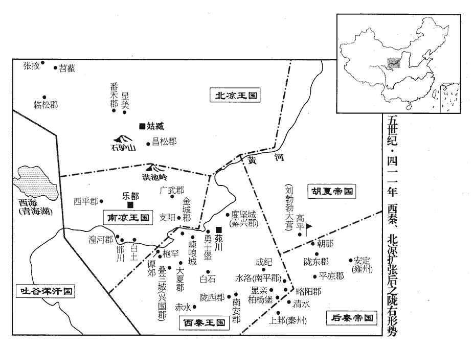 2秦‹都长安,陕西西安›廣平公弼有寵於秦王興‹时年四十六›,為雍州刺史,鎮安定‹甘肃镇原东南曙光乡›。姚秦分嶺北五郡置雍州刺史,鎮安定。雍,於用翻。姜紀諂附於弼,勸弼結興左右以求入朝。興徵弼為尚書令、侍中、大將軍。弼遂傾身結納朝士,朝,直遙翻。收采名勢,以傾東宮;國人惡之。惡,烏路翻。會興以西北多叛亂,欲命重將鎮撫之;將,即亮翻;下待將同。隴東‹甘肃平凉西北›太守郭播請使弼出鎮;魏收地形志有隴東郡,領涇陽、祖厲、撫夷三縣,不載立郡之始,蓋苻、姚所置也。西魏置隴東於汧源,唐之隴州是也。興不從,以太常索稜為太尉、領隴西‹甘肃陇西›內史,使招撫西秦。為索稜降西秦張本。索,昔各翻。西秦王乾歸遣使送所掠守宰,謝罪請降。謂去年克南安、略陽、隴西諸郡所得守宰也。使,疏吏翻。降,戶江翻。興遣鴻臚拜乾歸都督隴西•嶺‹九嵕山›北、【章:甲十一行本「北」下有「匈奴」二字;乙十一行本同;孔本同;張校同。】雜胡諸軍事、征西大將軍、河州‹府枹罕,甘肃临夏›牧、單于、河南王,太子熾磐為鎮西將軍、左賢王、平昌公。臚,陵如翻。單,音蟬。熾,昌志翻。