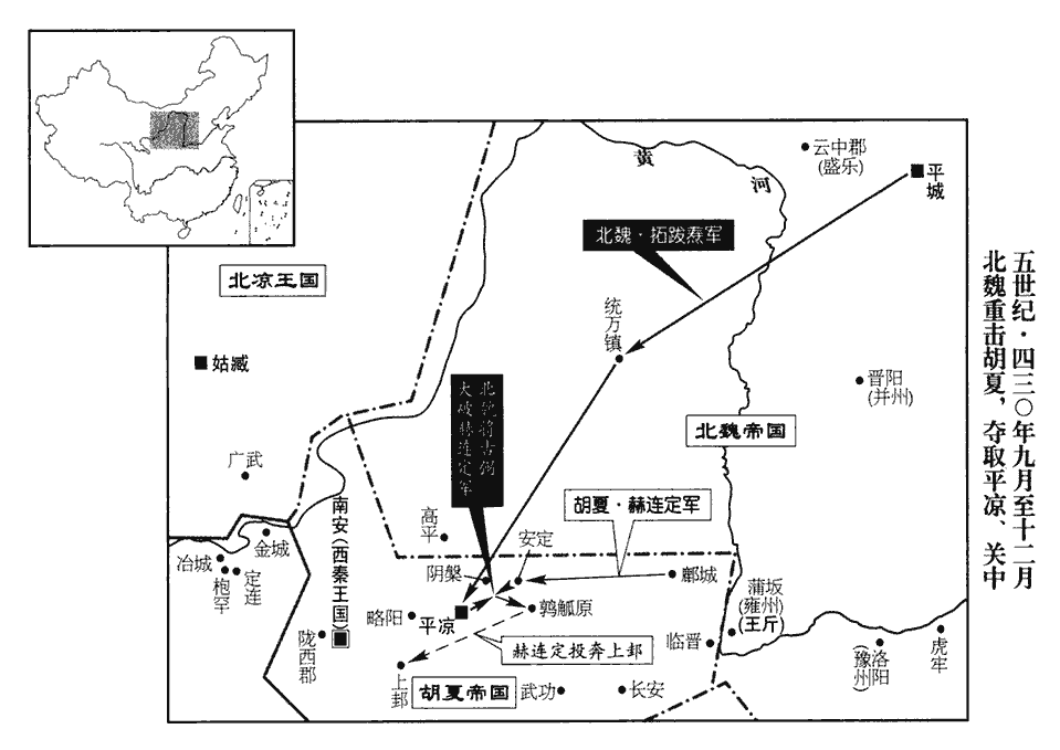 25十一月,乙酉‹三›,魏主至平涼‹甘肃华亭›,夏上谷公社干等嬰城固守;魏主使赫連昌招之,不下,乃使安西將軍古弼等將兵趣安定。趣,七喻翻。夏主自鄜城還安定,將步騎二萬北救平涼,與弼遇,弼僞退以誘之;將,卽亮翻。騎,奇寄翻。誘,音酉。夏主追之,魏主使高車馳擊之,夏兵大敗,斬首數千級。夏主還走,登鶉chún觚gū原‹甘肃灵台东南›,鶉觚縣,前漢屬北地,後漢、晉屬安定,有鶉觚原;唐天寶元年,改曰靈臺縣,屬涇州。鶉,殊倫翻。觚,音孤。爲方陳以自固,陳,讀曰陣。魏兵就圍之。