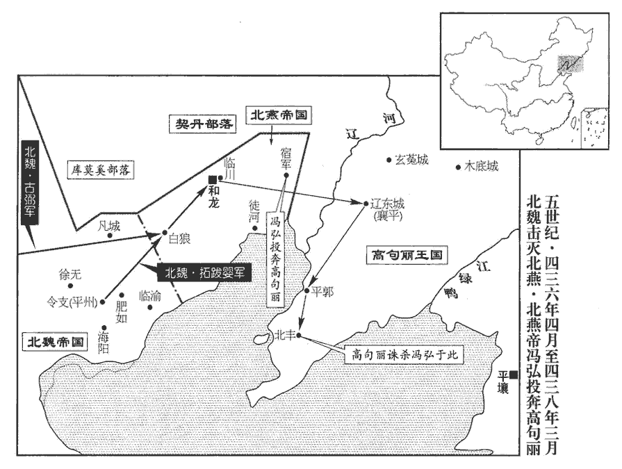 3初,燕王弘至遼東‹辽宁辽阳›,高麗王璉遣使勞之曰:麗,力知翻。璉,力展翻。使,疏吏翻。勞,力到翻。「龍城王馮君,爰適野次,士馬勞乎?」弘慙怒,稱制讓之;高麗處之平郭‹辽宁盖州›,處,昌呂翻。尋徙北豐‹辽宁瓦房店›。弘素侮高麗,政刑賞罰,猶如其國;高麗乃奪其侍人,取其太子王仁爲質。質,音致。弘怨高麗,遣使上表求迎,上‹刘义隆›遣使者王白駒等迎之,幷令高麗資遣。高麗王不欲使弘南來,遣將孫漱、高仇等殺弘于北豐‹辽宁瓦房店›,幷其子孫十餘人,果如楊㟭之言。將,卽亮翻;下同。諡弘曰昭成皇帝。白駒等帥所領七千餘人掩討漱、仇、殺仇,生擒漱。高麗王以白駒等專殺,遣使執送之。上以遠國,不欲違其意,下白駒等獄,下,遐稼翻。已而原之。