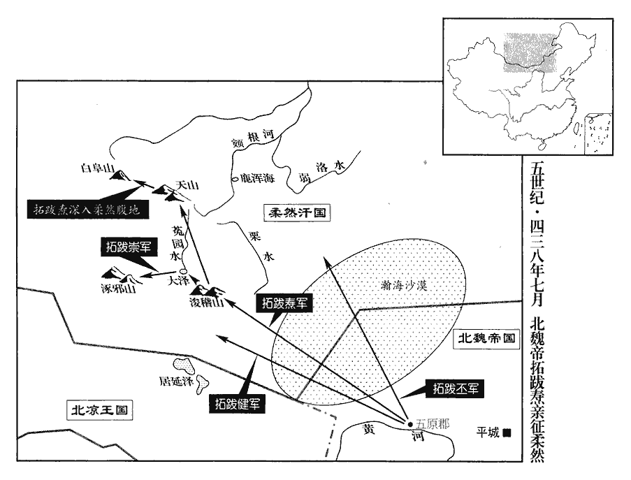 6丙申‹二十七›,魏主如五原‹内蒙包头›;秋,七月,自五原北伐柔然‹瀚海沙漠群›。命樂平王丕督十五將出東道,永昌王健督十五將出西道,魏主自出中道。至浚稽山‹蒙古肯特山›,復分中道爲二:陳留王崇從大澤‹蒙古鄂罗克泊,图青河南源头›向涿邪山‹蒙古古尔班察罕山›,魏主從浚稽北向天山‹燕然山,蒙古杭爱山›,西登白阜‹杭爱山主峰之一›,天山在漠北,卽唐鐵勒思結、多濫葛所保之地,非伊吾之折羅漫山也。白阜,疑卽雪山。復,扶又翻。邪,讀曰耶。不見柔然而還。時漠北大旱,無水草,人馬多死。