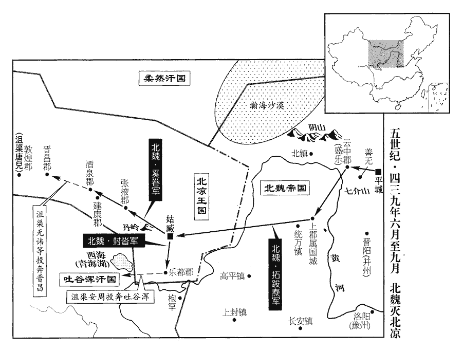 9酒泉城中食盡,萬餘口皆餓死,沮渠天周殺妻以食戰士。食,祥吏翻。庚子‹二十二›,魏奚眷拔酒泉,獲天周,送平城,殺之。沮渠無諱乏食,且畏魏兵之盛,乃謀西度流沙,遣其弟安周西擊鄯善‹都扜wū泥,新疆若羌›。鄯善王欲降,鄯,上善翻。降,戶江翻。會魏使者至,勸令拒守;安周不能克,退保東城‹若羌东›。鄯善國之東城也。