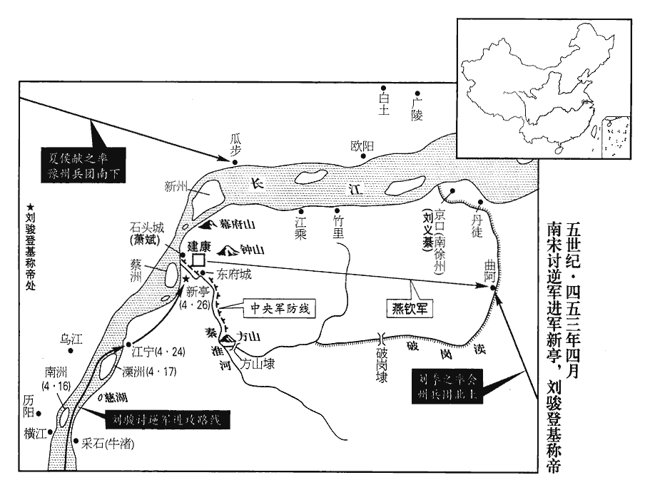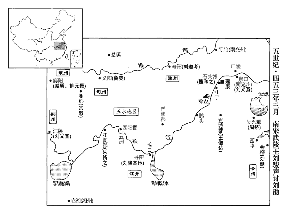 11乙未‹二十二›,武陵王發西陽‹湖北黄州›;丁酉‹二十四›,至尋陽‹江西九江›。庚子‹二十七›,王命顏竣移檄四方,《考異》曰︰《宋略》移檄亦在庚申日。按《謝莊傳》曰︰「奉三月二十七日檄」,然則發檄在庚子日也。使共討劭。州郡承檄,翕然響應。南譙王義宣遣臧質引兵詣尋陽,與駿同下,留魯爽於江陵。