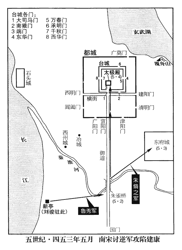 癸亥‹二十一›,柳元景潛至新亭‹南京西南›,依山爲壘。《考異》曰:《宋略》云:「壬戌,元景次新林,依山爲壘。」按《本紀》:「癸亥,元景至新亭。」《元景傳》:「元景至新亭經日,劭乃水陸出軍。」今從之。新降者皆勸元景速進,元景曰:「不然。理順難恃,同惡相濟,輕進無防,實啓寇心。」《兵法》所謂「先爲不可勝以待敵之可勝」,柳元景以之。