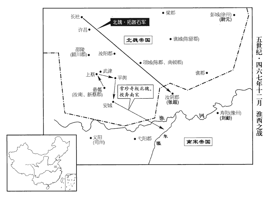 6二月,魏西河公石自懸瓠‹河南汝南›引兵攻汝陰‹安徽阜阳›太守張超,不克;此汝陰郡蓋猶治汝陰也;當在隋蔡州新蔡縣界。守,式又翻。《考異》曰:《宋•帝紀》云:「索虜寇汝陰,太守張景遠擊破之。」景遠,卽超也。《宋略》,「七月,張景遠先卒,汝陰城又陷」,亦誤也。今從《後魏書》。退屯陳項‹河南沈丘›,陳、項本二邑,時陳郡治項,因曰陳項。議還長社‹河南长葛›,待秋擊之。鄭羲曰:「張超蟻聚窮命,糧食已盡,不降當走,可翹足而待也。今棄之遠去,超修城浚隍,積薪儲穀,更來恐難圖矣。」石不從,遂還長社。爲石再攻汝陰‹安徽阜阳›不克張本。