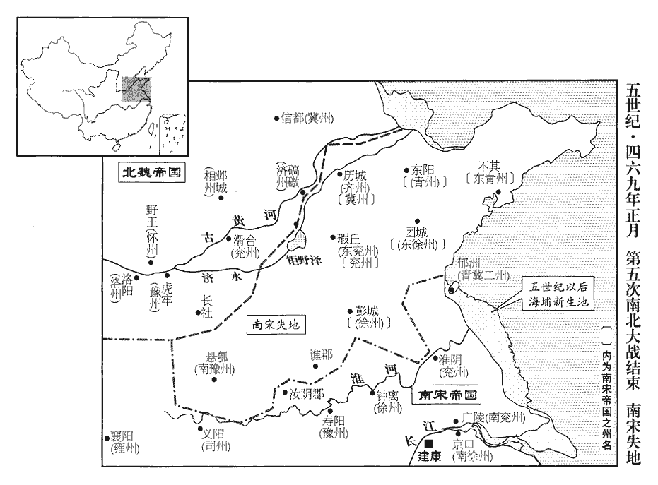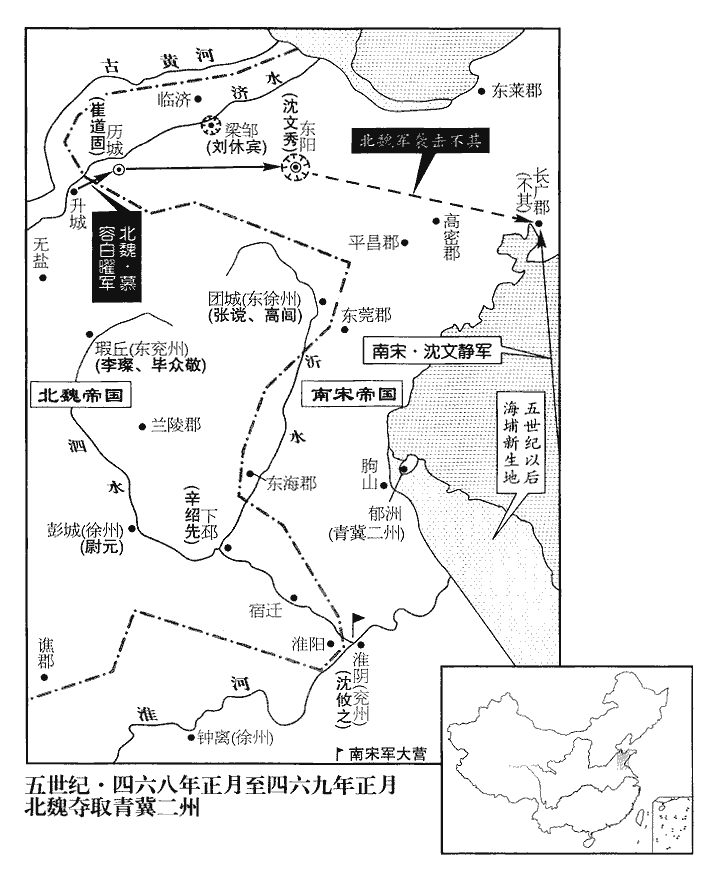 9沈攸之之自彭城還也,留長水校尉王玄載守下邳‹江苏睢宁北古邳镇›,校,戶敎翻。積射將軍沈韶守宿豫‹江苏宿迁›,睢陵‹江苏睢宁›、淮陽‹安徽宿州东北›皆留兵戍之。玄載,玄謨之從弟也。王玄謨以功名著於太祖、世祖二朝。從,才用翻。時東平太守申纂守無鹽‹山东东平东›,幽州刺史劉休賓守梁鄒‹山东邹平北›,梁鄒縣,漢屬濟南郡。幷州刺史清河‹山东淄博南›房崇吉守升城‹山东长清西南›,魏收《志》:東太原郡太原縣治升城,其地在唐濟州長清縣界。輔國將軍清河‹山东淄博南›張讜守團城‹山东沂水县›,《水經註》:琅邪郡東莞縣,春秋之鄆邑,今有鄆亭在團城東北四十里。及兗州刺史王整、蘭陵‹山东滕州东南›太守桓忻,沈約《志》:蘭陵太守治昌慮,漢舊縣也。肥城‹山东肥城›、糜溝‹肥城境›、垣苗‹山东长清西南›等戍皆不附於魏。肥城縣,前漢屬泰山郡,後漢屬濟北郡,晉罷,宋復置濟北郡於肥城。魏收《志》:糜溝、垣苗二城亦在東太原郡大原縣界。又據《水經註》:濟水自平陰城西東北流,逕垣苗城西。宋武帝西征長安,令垣苗鎭此,故俗以爲稱。濟水又東北過盧縣北。賢曰:肥城縣故城,在今濟州平陰縣東南。則此三戍皆在漢太山郡盧縣及肥城縣界,至後漢和帝永安二年,始分太山爲濟北郡。休賓,乘民之兄子也。劉乘民見上卷上年。
